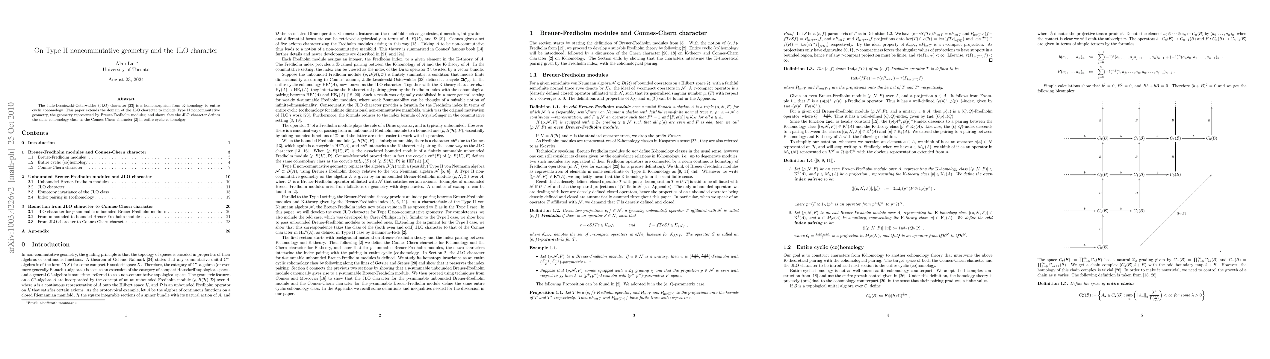 This paper extends the Jaffe-Lesniewski-Osterwalder (JLO) character to Type II noncommutative geometry and demonstrates that it aligns with the Chern-Connes character in entire cyclic cohomology.