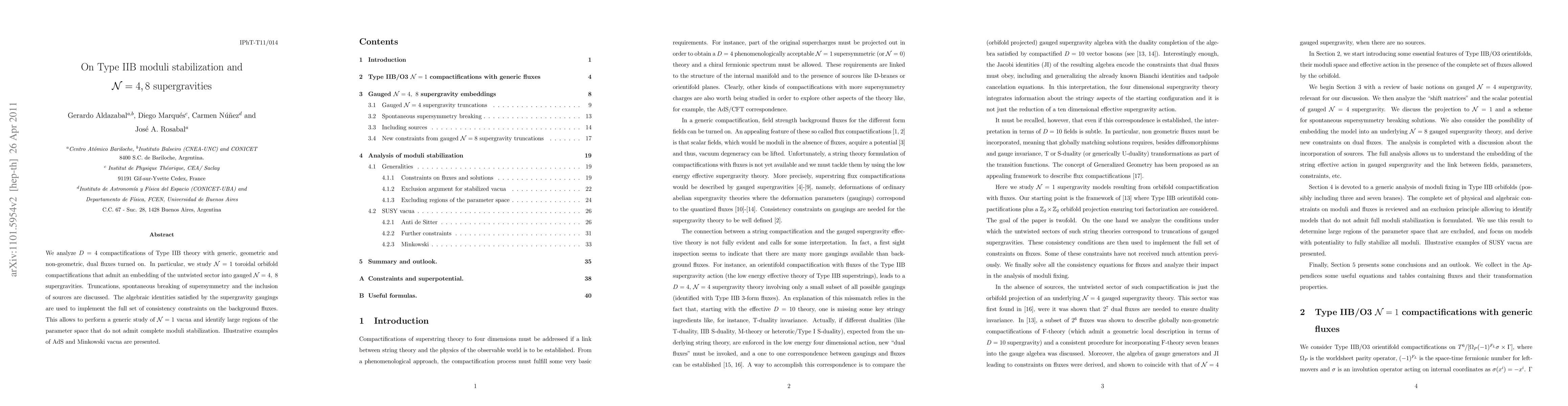 This research explores D=4 Type IIB compactifications with varied fluxes, focusing on N=1 orbifolds embeddable in N=4, 8 gauged supergravities. Utilizing supergravity gauging identities, it identifies extensive parameter spaces lacking full moduli stabilization, presenting AdS and Minkowski vacuum examples.