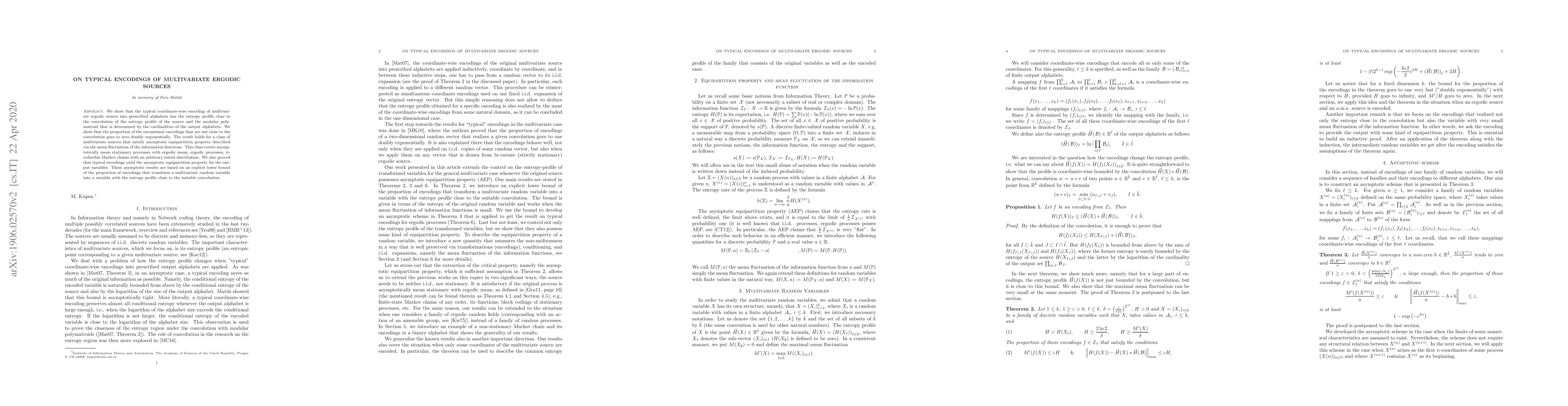 We show that the typical coordinate-wise encoding of multivariate ergodic source into prescribed alphabets has the entropy profile close to the convolution of the entropy profile of the source and the modular polymatroid that is determined by the cardinalities of the output alphabets. We show that the proportion of the exceptional encodings that are not close to the convolution goes to zero doubly exponentially. The result holds for a class of multivariate sources that satisfy asymptotic equipartition property described via the mean fluctuation of the information functions. This class covers asymptotically mean stationary processes with ergodic mean, ergodic processes, irreducible Markov chains with an arbitrary initial distribution. We also proved that typical encodings yield the asymptotic equipartition property for the output variables. These asymptotic results are based on an explicit lower bound of the proportion of encodings that transform a multivariate random variable into a variable with the entropy profile close to the suitable convolution.