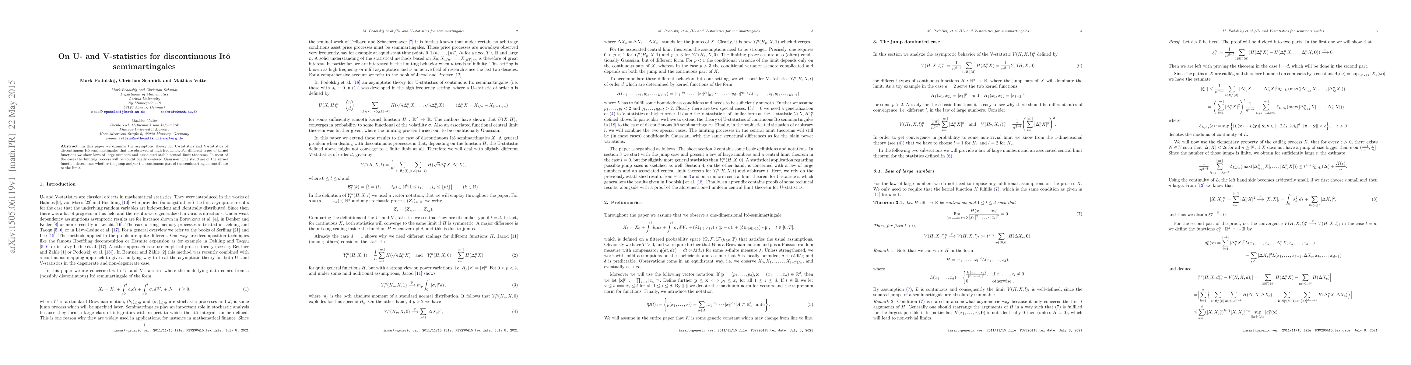This paper explores the asymptotic behavior of U-statistics and V-statistics for discontinuous Ito semimartingales observed at high frequency, proving laws of large numbers and central limit theorems. The limiting process is typically a conditionally centered Gaussian, with the kernel function dictating the contribution of the jump and continuous parts.