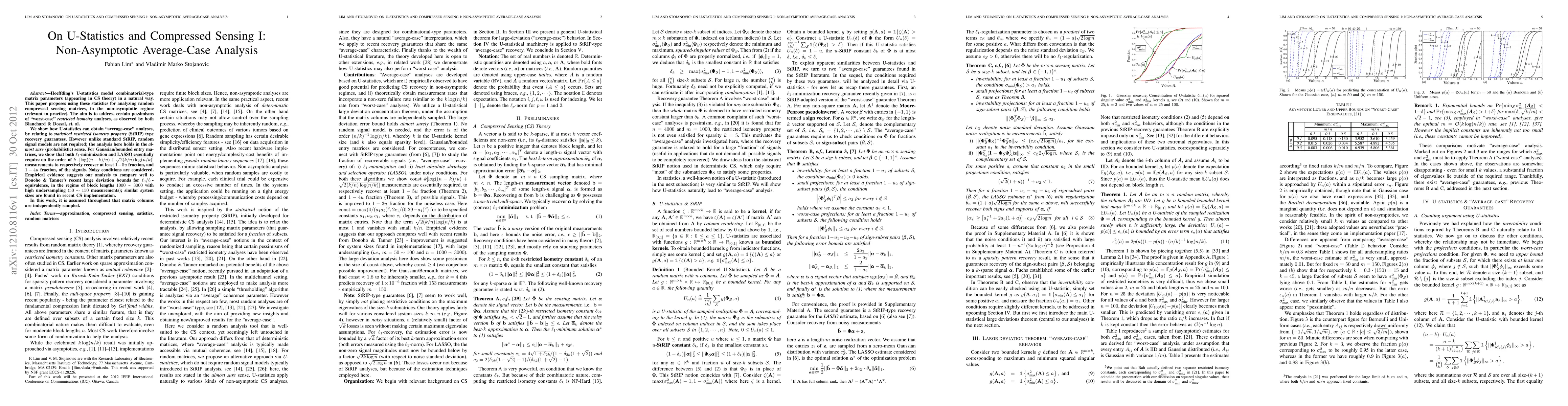 Hoeffding's U-statistics model combinatorial-type matrix parameters (appearing in CS theory) in a natural way. This paper proposes using these statistics for analyzing random compressed sensing matrices, in the non-asymptotic regime (relevant to practice). The aim is to address certain pessimisms of "worst-case" restricted isometry analyses, as observed by both Blanchard & Dossal, et. al. We show how U-statistics can obtain "average-case" analyses, by relating to statistical restricted isometry property (StRIP) type recovery guarantees. However unlike standard StRIP, random signal models are not required; the analysis here holds in the almost sure (probabilistic) sense. For Gaussian/bounded entry matrices, we show that both l1-minimization and LASSO essentially require on the order of k \cdot [\log((n-k)/u) + \sqrt{2(k/n) \log(n/k)}] measurements to respectively recover at least 1-5u fraction, and 1-4u fraction, of the signals. Noisy conditions are considered. Empirical evidence suggests our analysis to compare well to Donoho & Tanner's recent large deviation bounds for l0/l1-equivalence, in the regime of block lengths 1000-3000 with high undersampling (50-150 measurements); similar system sizes are found in recent CS implementation. In this work, it is assumed throughout that matrix columns are independently sampled.