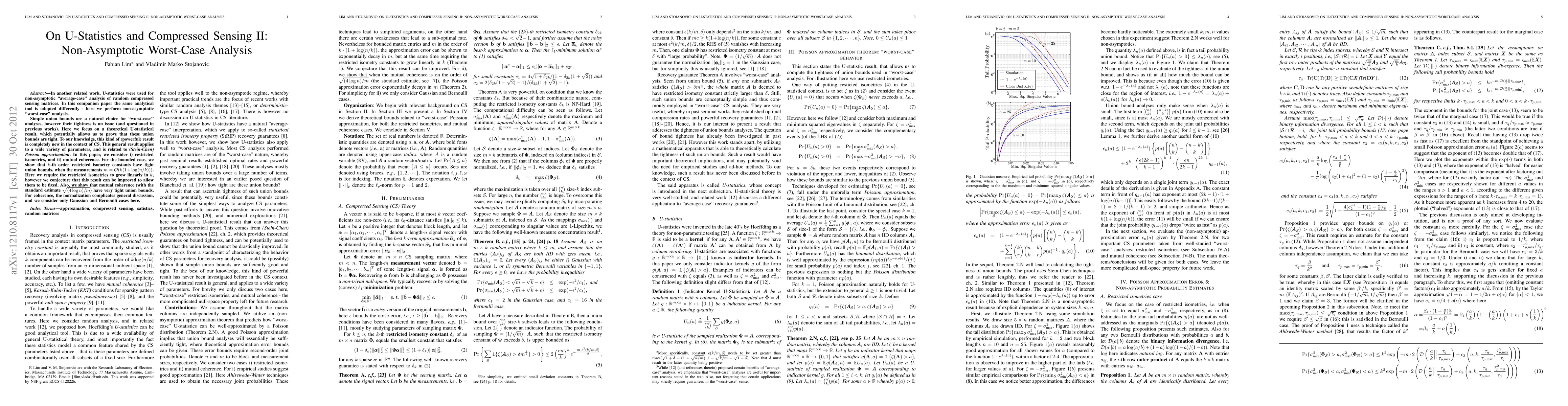 In another related work, U-statistics were used for non-asymptotic "average-case" analysis of random compressed sensing matrices. In this companion paper the same analytical tool is adopted differently - here we perform non-asymptotic "worst-case" analysis. Simple union bounds are a natural choice for "worst-case" analyses, however their tightness is an issue (and questioned in previous works). Here we focus on a theoretical U-statistical result, which potentially allows us to prove that these union bounds are tight. To our knowledge, this kind of (powerful) result is completely new in the context of CS. This general result applies to a wide variety of parameters, and is related to (Stein-Chen) Poisson approximation. In this paper, we consider i) restricted isometries, and ii) mutual coherence. For the bounded case, we show that k-th order restricted isometry constants have tight union bounds, when the measurements m = \mathcal{O}(k (1 + \log(n/k))). Here we require the restricted isometries to grow linearly in k, however we conjecture that this result can be improved to allow them to be fixed. Also, we show that mutual coherence (with the standard estimate \sqrt{(4\log n)/m}) have very tight union bounds. For coherence, the normalization complicates general discussion, and we consider only Gaussian and Bernoulli cases here.