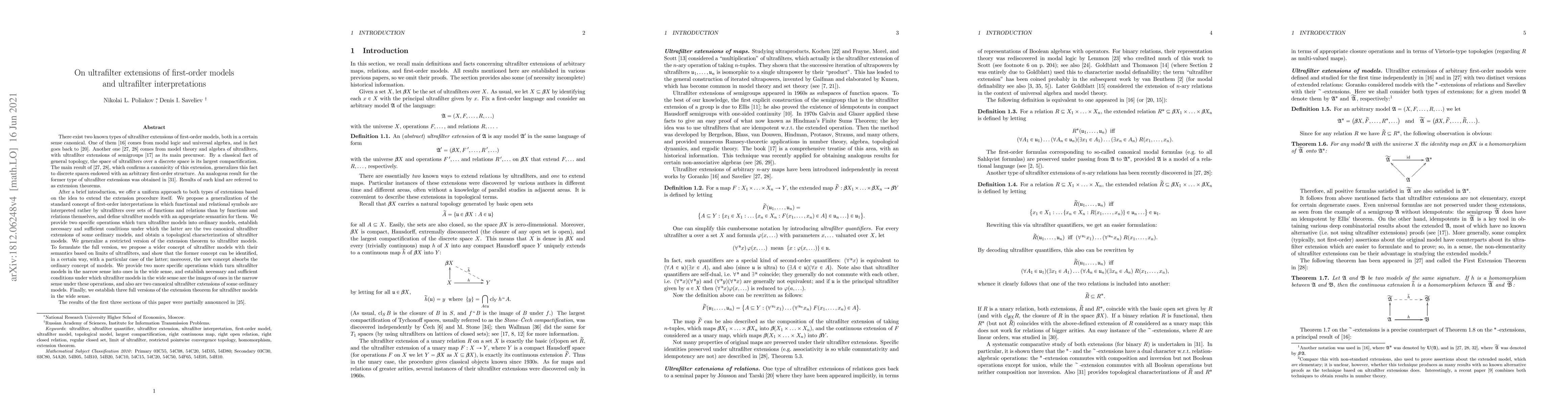 There exist two known canonical types of ultrafilter extensions of first-order models; one comes from modal logic and universal algebra, another one from model theory and algebra of ultrafilters, with ultrafilter extensions of semigroups as its main precursor. By a classical fact of general topology, the space of ultrafilters over a discrete space is its largest compactification; the ultrafilter extensions generalize this fact to discrete spaces endowed with an arbitrary first-order structure. Results of such kind are referred to as extension theorems. We offer a uniform approach to both types of extensions based on the idea to extend the extension procedure itself. Then we propose a generalization of the standard concept of first-order interpretations in which functional and relational symbols are interpreted rather by ultrafilters over sets of functions and relations than by functions and relations themselves, and define ultrafilter models with an appropriate semantics for them. We establish necessary and sufficient conditions under which ultrafilter models coincide with the canonical ultrafilter extensions of some ordinary models, and obtain their topological characterization. Further we propose even a wider concept of ultrafilter models together with their semantics based on limits of ultrafilters, and show that the new concept absorbs the former one as well as the ordinary concept of first-order models. We establish necessary and sufficient conditions under which ultrafilter models in the wide sense coincide with those in the narrow sense or with the ultrafilter extensions of some ordinary models. Finally we prove extension theorems for ultrafilter models.