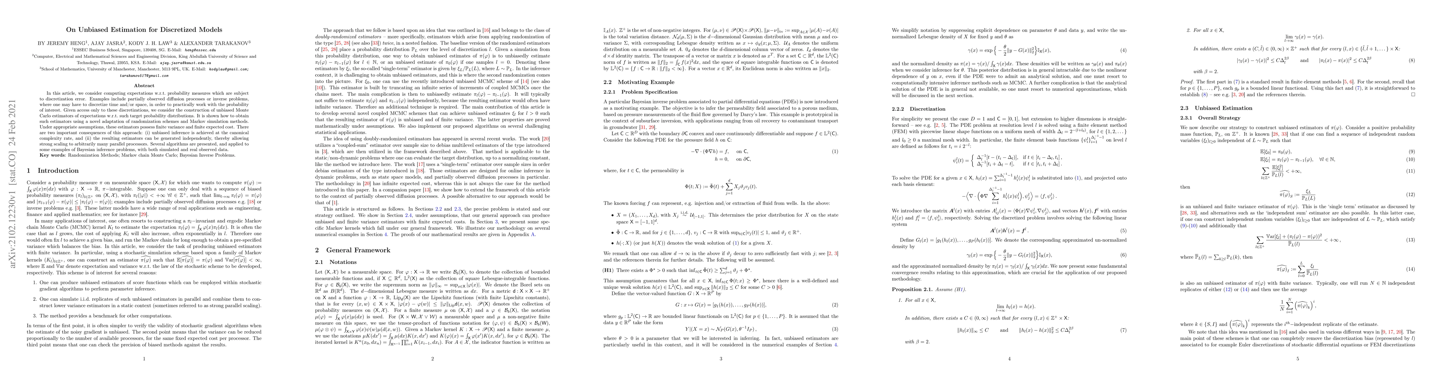This research presents a method for unbiased estimation of expectations in discretized models, like partially observed diffusions or inverse problems, using novel randomization schemes and Markov simulation techniques. The approach ensures finite variance and cost, enabling parallel processing and unbiased inference at optimal complexity rates.