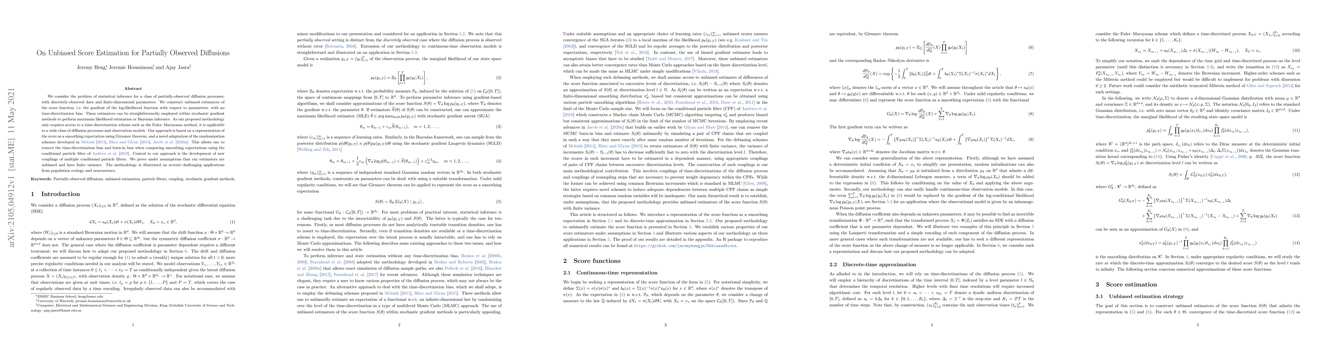 This paper develops unbiased estimators for the score function of partially observed diffusion processes, eliminating time-discretization bias. The method uses a representation of the score via smoothing expectations and novel adaptations of randomization schemes, enabling application to various diffusion processes and observation models.