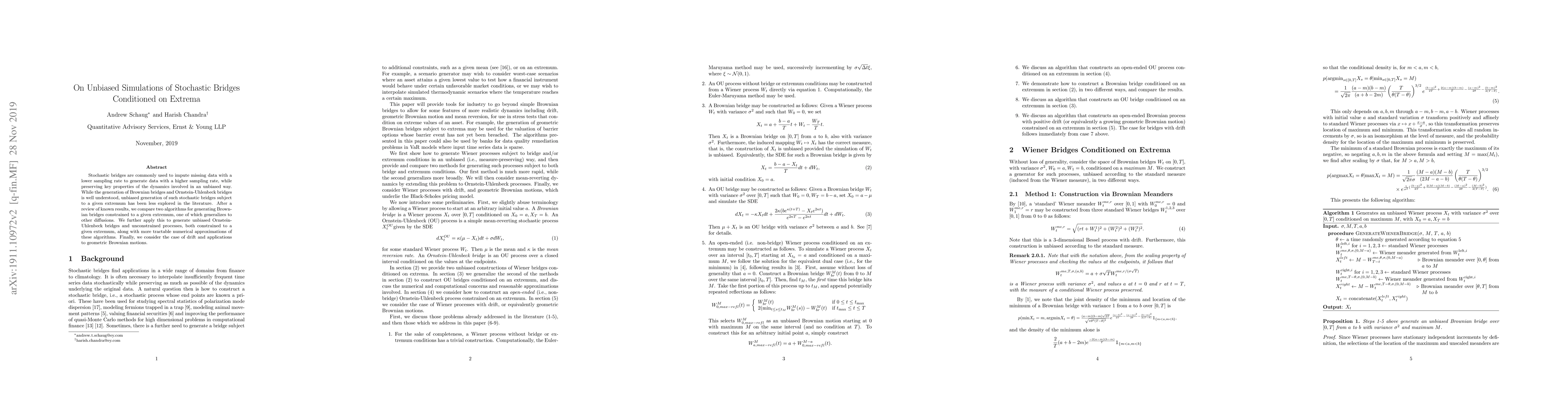 This paper reviews and compares algorithms for generating unbiased stochastic bridges, particularly Brownian and Ornstein-Uhlenbeck bridges, conditioned on a given extremum. It introduces a generalized algorithm for Brownian bridges and applies it to generate unbiased Ornstein-Uhlenbeck bridges, along with numerical approximations and considerations for drift in geometric Brownian motions.