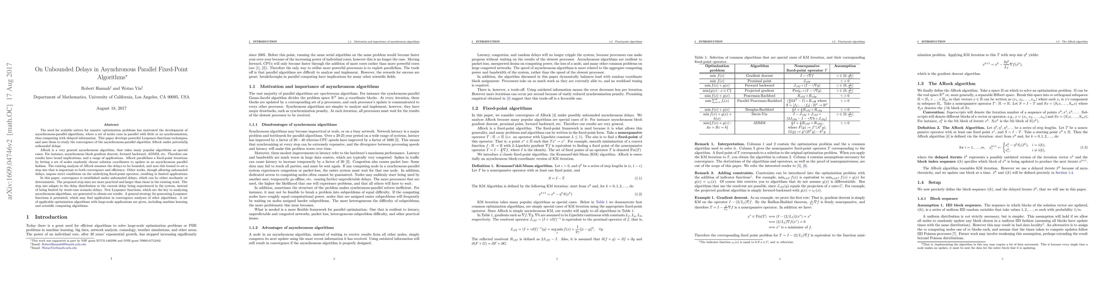 The need for scalable numerical solutions has motivated the development of asynchronous parallel algorithms, where a set of nodes run in parallel with little or no synchronization, thus computing with delayed information. This paper studies the convergence of the asynchronous parallel algorithm ARock under potentially unbounded delays. ARock is a general asynchronous algorithm that has many applications. It parallelizes fixed-point iterations by letting a set of nodes randomly choose solution coordinates and update them in an asynchronous parallel fashion. ARock takes some recent asynchronous coordinate descent algorithms as special cases and gives rise to new asynchronous operator-splitting algorithms. Existing analysis of ARock assumes the delays to be bounded, and uses this bound to set a step size that is important to both convergence and efficiency. Other work, though allowing unbounded delays, imposes strict conditions on the underlying fixed-point operator, resulting in limited applications. In this paper, convergence is established under unbounded delays, which can be either stochastic or deterministic. The proposed step sizes are more practical and generally larger than those in the existing work. The step size adapts to the delay distribution or the current delay being experienced in the system. New Lyapunov functions, which are the key to analyzing asynchronous algorithms, are generated to obtain our results. A set of applicable optimization algorithms with large-scale applications are given, including machine learning and scientific computing algorithms.