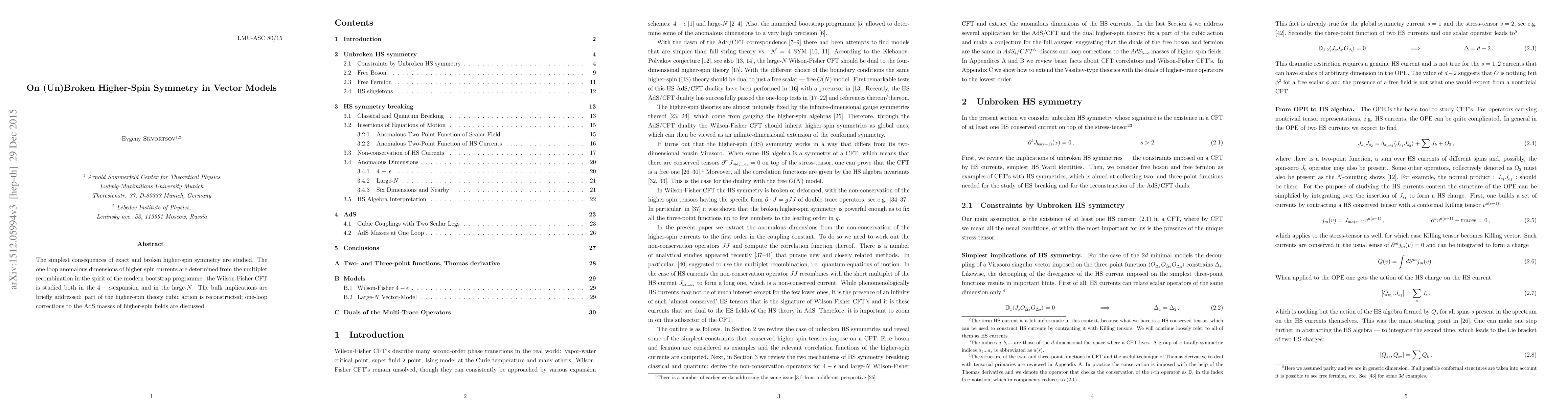The simplest consequences of exact and broken higher-spin symmetry are studied. The one-loop anomalous dimensions of higher-spin currents are determined from the multiplet recombination in the spirit of the modern bootstrap programme: the Wilson-Fisher CFT is studied both in the epsilon-expansion and in the large-N. The bulk implications are briefly addressed: part of the higher-spin theory cubic action is reconstructed; one-loop corrections to the AdS masses of higher-spin fields are discussed.