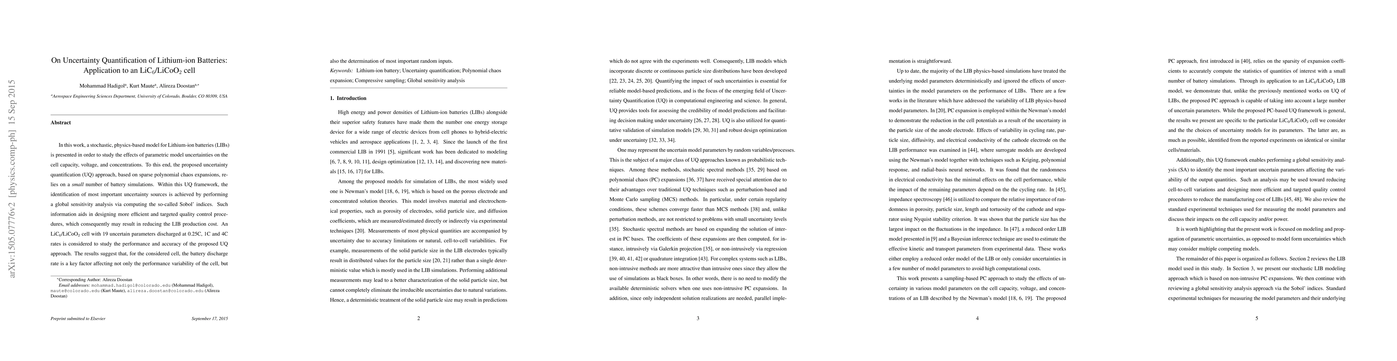 In this work, a stochastic, physics-based model for Lithium-ion batteries (LIBs) is presented in order to study the effects of parametric model uncertainties on the cell capacity, voltage, and concentrations. To this end, the proposed uncertainty quantification (UQ) approach, based on sparse polynomial chaos expansions, relies on a small number of battery simulations. Within this UQ framework, the identification of most important uncertainty sources is achieved by performing a global sensitivity analysis via computing the so-called Sobol' indices. Such information aids in designing more efficient and targeted quality control procedures, which consequently may result in reducing the LIB production cost. An LiC$_6$/LiCoO$_2$ cell with 19 uncertain parameters discharged at 0.25C, 1C and 4C rates is considered to study the performance and accuracy of the proposed UQ approach. The results suggest that, for the considered cell, the battery discharge rate is a key factor affecting not only the performance variability of the cell, but also the determination of most important random inputs.