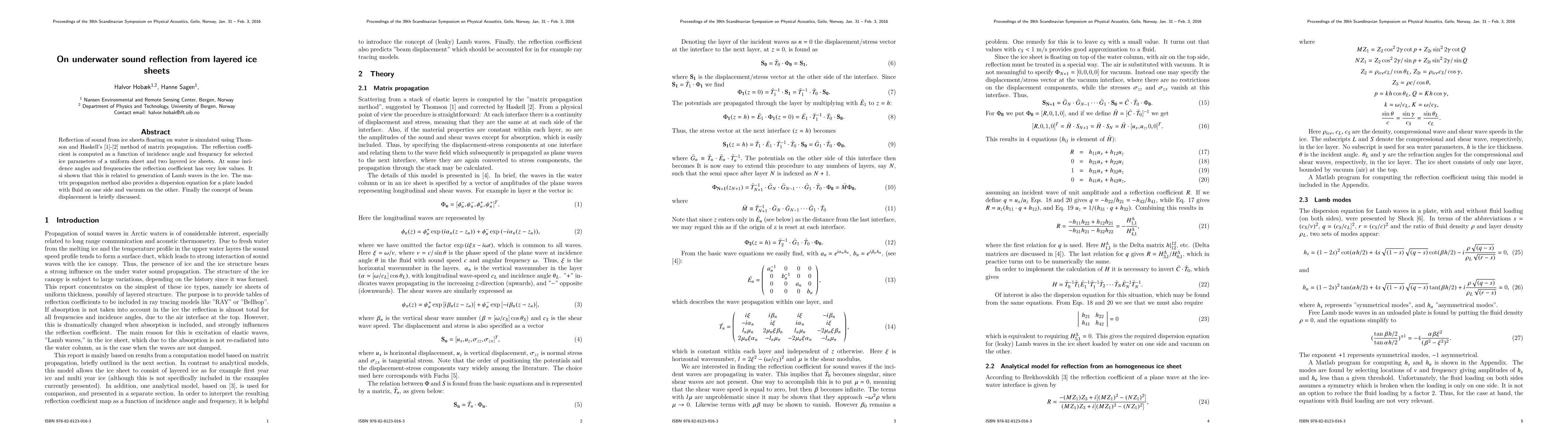 Reflection of sound from ice sheets floating on water is simulated using Thomson and Haskell's method of matrix propagation. The reflection coefficient is computed as a function of incidence angle and frequency for selected ice parameters of a uniform sheet and two layered ice sheets. At some incidence angles and frequencies the reflection coefficient has very low values. It is shown that this is related to generation of Lamb waves in the ice. The matrix propagation method also provides a dispersion equation for a plate loaded with fluid on one side and vacuum on the other. Finally the concept of beam displacement is briefly discussed.