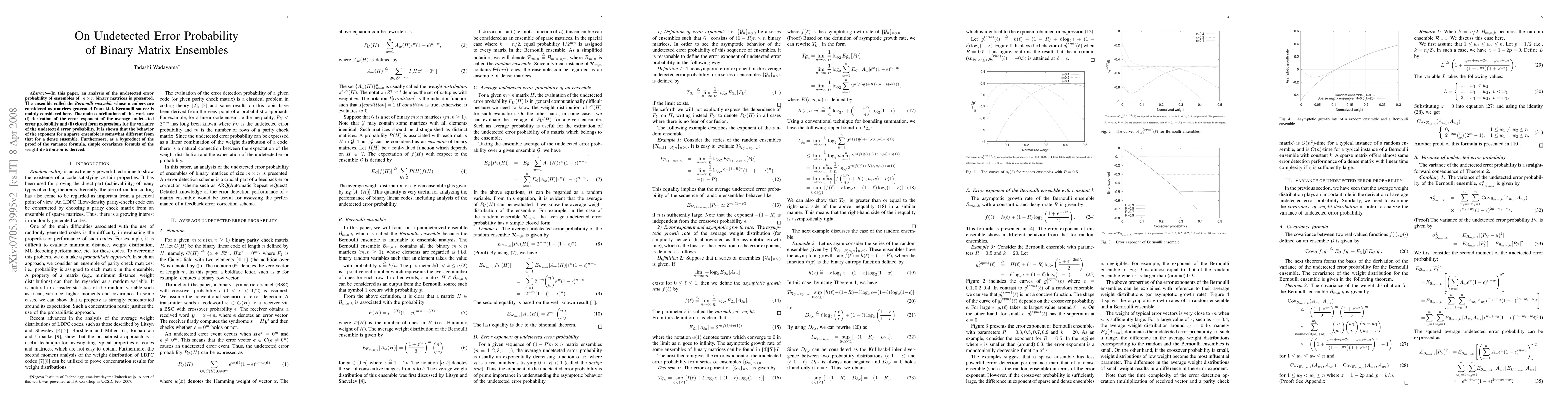 This paper analyzes the probability of undetected errors in binary matrix ensembles, deriving a key exponent and closed-form expressions for variance, with implications for sparse and dense ensemble behaviors.