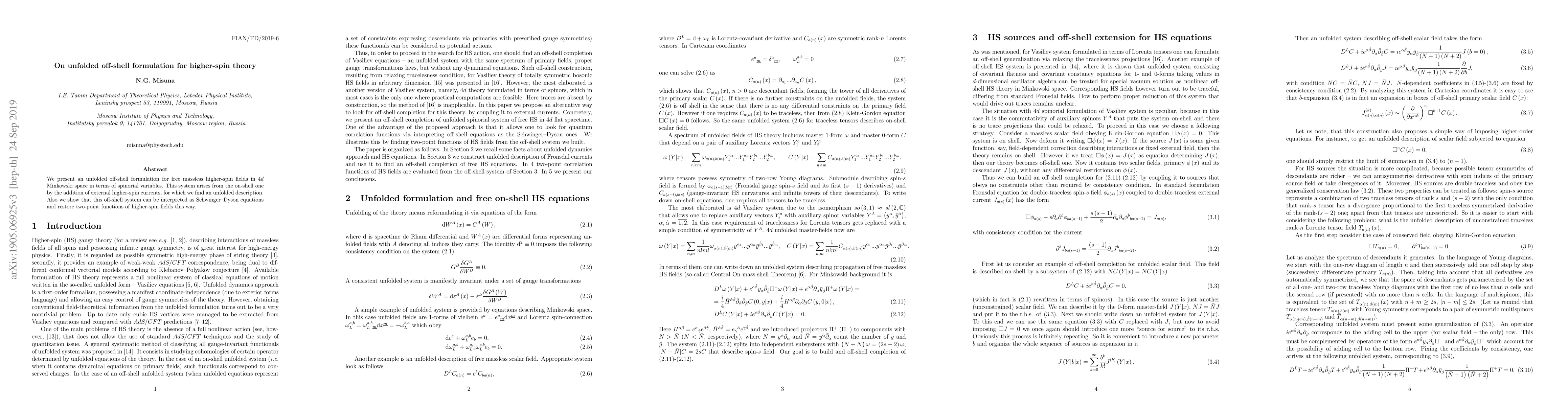 This paper introduces an unfolded off-shell formulation for free massless higher-spin fields in 4d Minkowski space using spinorial variables, extending the on-shell system with external higher-spin currents, and demonstrates its equivalence to Schwinger-Dyson equations to restore two-point functions.