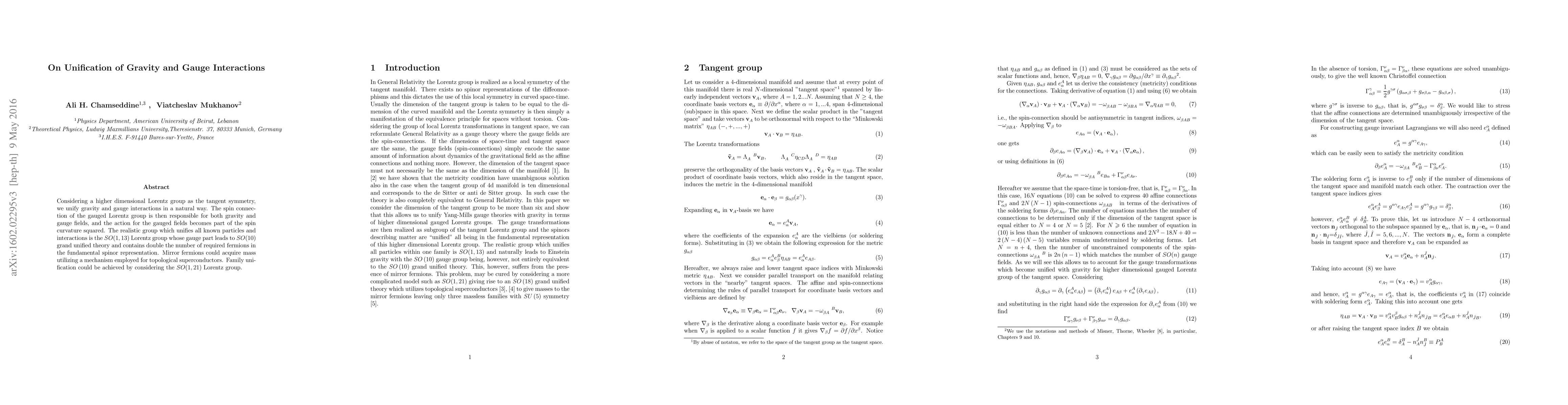 Considering a higher dimensional Lorentz group as the tangent symmetry, we unify gravity and gauge interactions in a natural way. The spin connection of the gauged Lorentz group is then responsible for both gravity and gauge fields, and the action for the gauged fields becomes part of the spin curvature squared. The realistic group which unifies all known particles and interactions is the $SO(1,13)$ Lorentz group whose gauge part leads to $SO(10)$ grand unified theory and contains double the number of required fermions in the fundamental spinor representation. Mirror fermions could acquire mass utilizing a mechanism employed for topological superconductors. Family unification could be achieved by considering the $SO(1,21)$ Lorentz group.