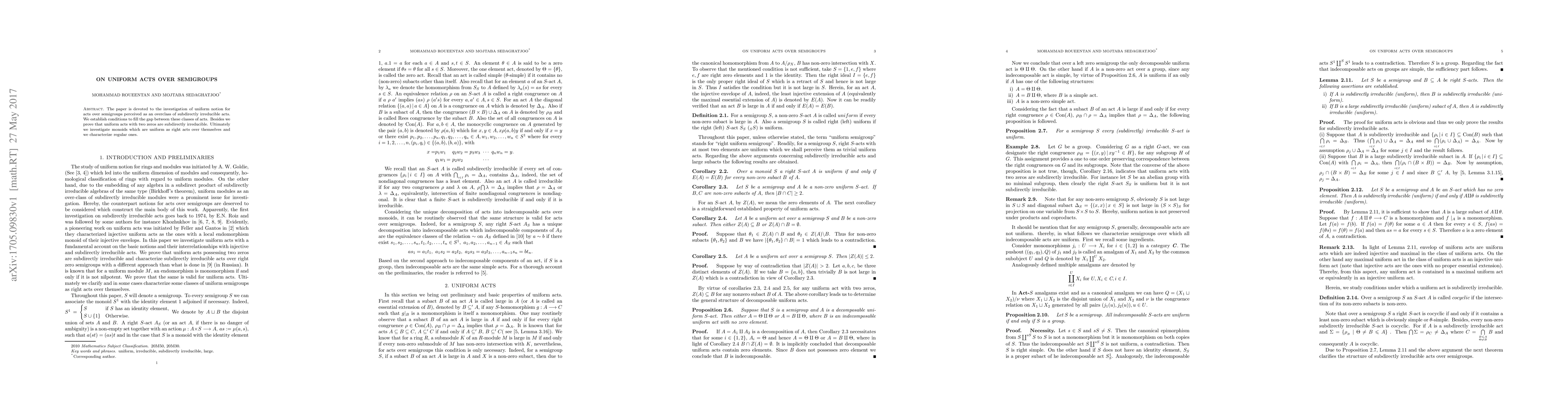 This paper explores the uniform notion for acts over semigroups, establishing conditions to bridge subdirectly irreducible acts and uniform acts with two zeros, which are shown to be subdirectly irreducible. It also characterizes regular monoids that are uniform as right acts over themselves.