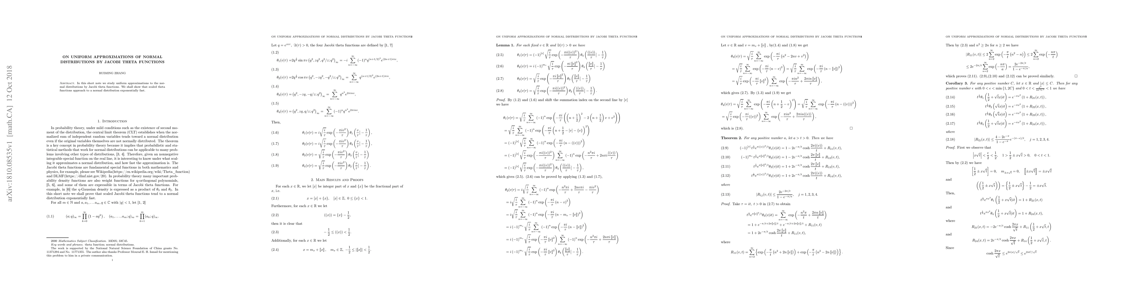 Summary: This paper investigates the uniform approximation of normal distributions using Jacobi theta functions, demonstrating that scaled theta functions converge to a normal distribution exponentially quickly.
