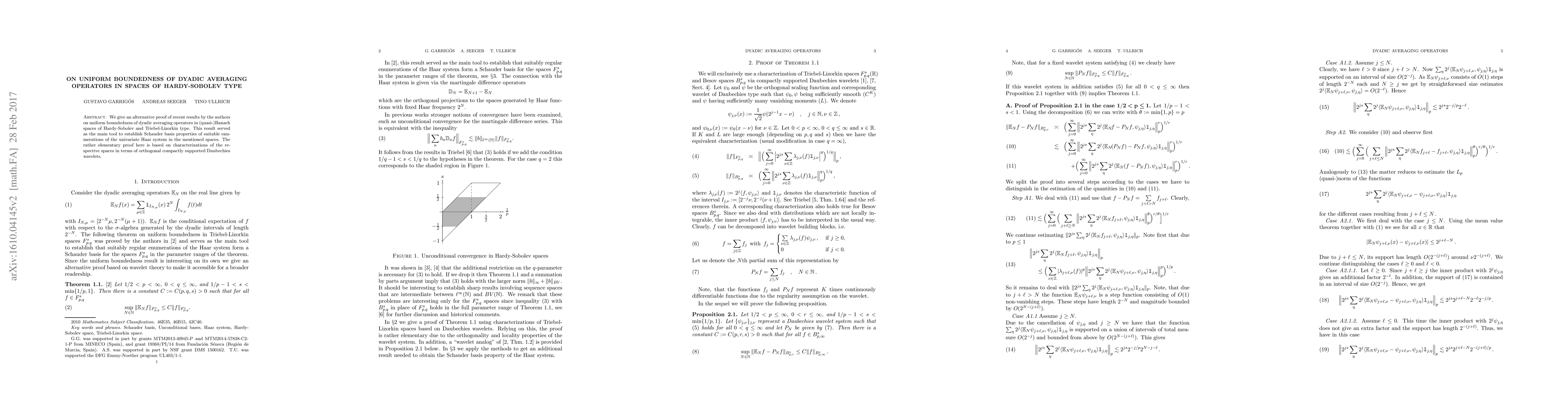 This paper provides an elementary proof for the uniform boundedness of dyadic averaging operators in Hardy-Sobolev and Triebel-Lizorkin spaces, using characterizations via orthogonal compactly supported Daubechies wavelets. This result supports the establishment of Schauder basis properties for specific enumerations of the univariate Haar system in these spaces.