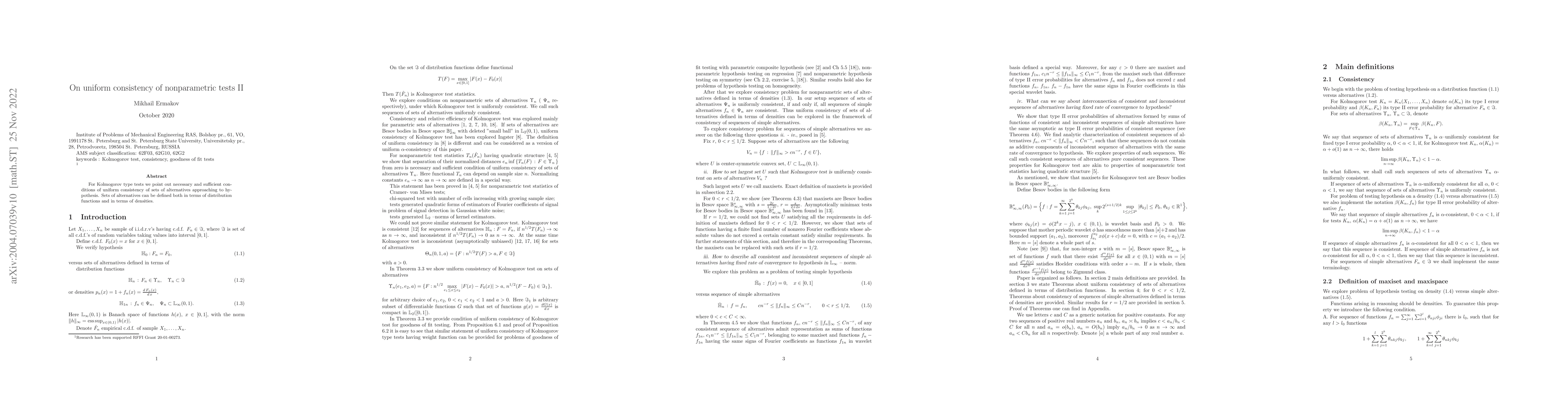 Summary: This paper establishes the uniform consistency conditions for the Kolmogorov test under sets of alternatives approaching the null hypothesis, defining these sets through both distribution functions and densities. The findings contribute to the robustness of nonparametric testing methods.