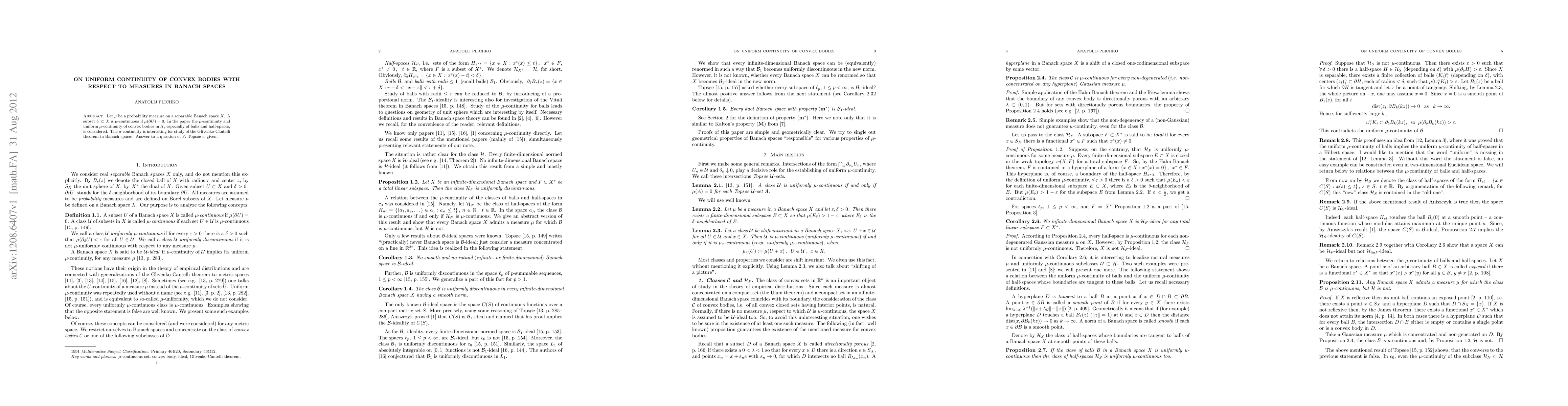 This paper investigates the uniform continuity of convex bodies, particularly balls and half-spaces, in separable Banach spaces with respect to a given probability measure $\mu$. It addresses the $\mu$-continuity and provides a solution to a question posed by F. Topsøe regarding the Glivenko-Cantelli theorem in this context.