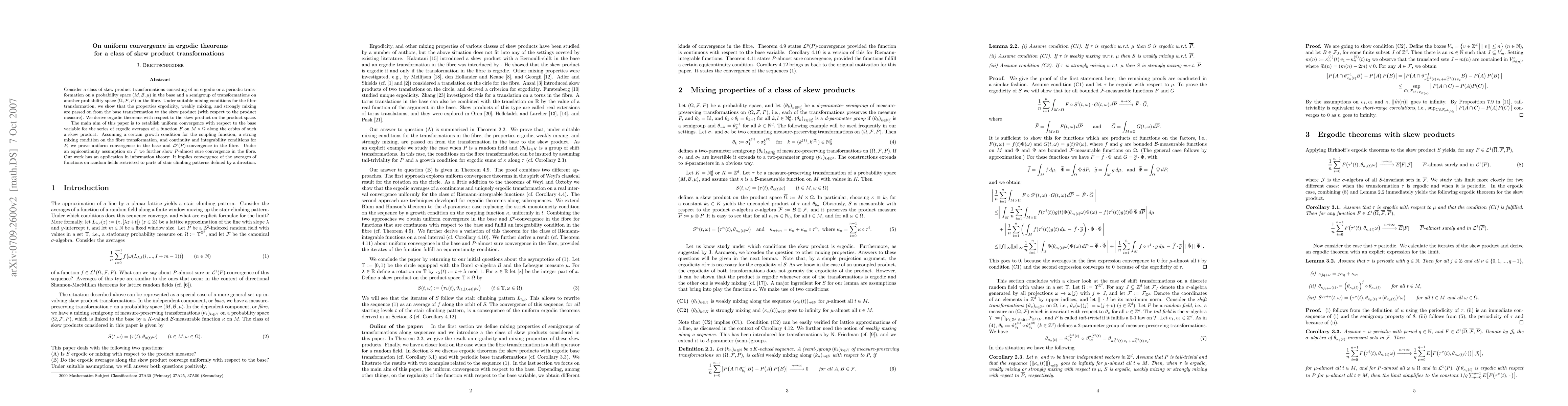 This paper investigates uniform convergence in ergodic theorems for a class of skew product transformations, demonstrating that ergodicity and mixing properties transfer from the base to the skew product under suitable conditions. It establishes uniform convergence for ergodic averages on the product space, with applications in information theory for convergence of averages on random fields.