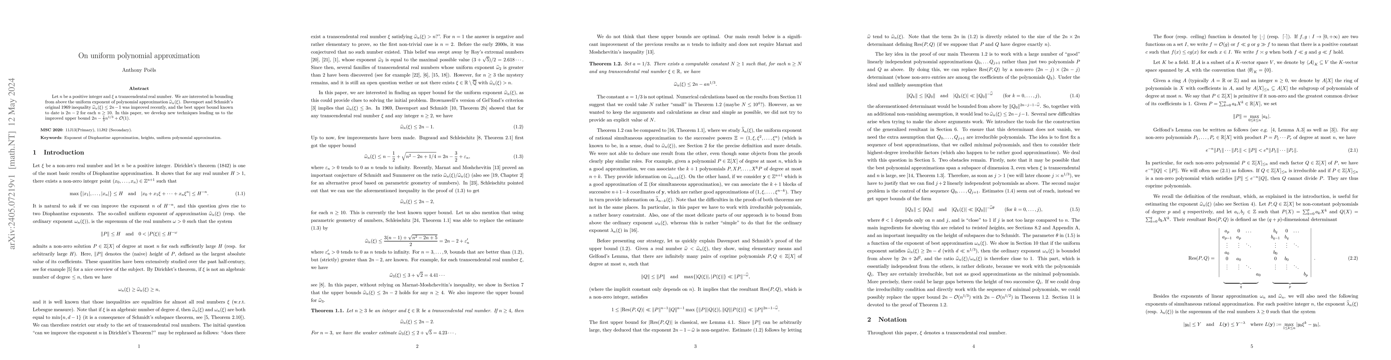 This paper refines the upper bound for the uniform polynomial approximation exponent $\widehat{\omega}_n(\xi)$ for transcendental real numbers, improving upon Davenport and Schmidt's 1969 result from $2n-1$ to $2n-\frac{1}{3}n^{1/3}+\mathcal{O}(1)$ for $n\geq 10$. New techniques are developed to achieve this enhancement.