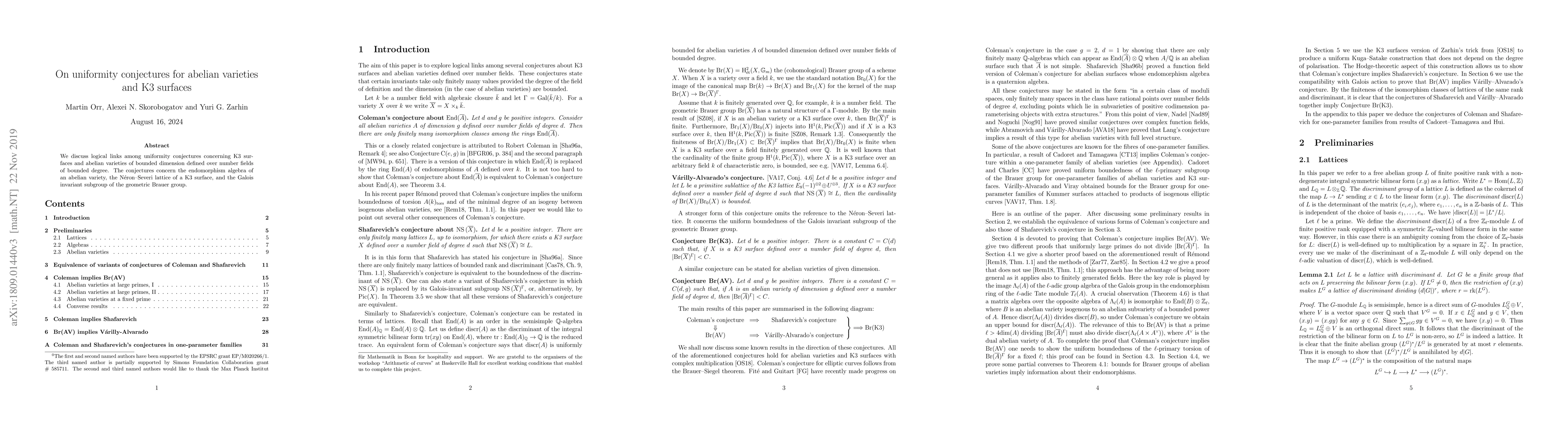 We discuss logical links among uniformity conjectures concerning K3 surfaces and abelian varieties of bounded dimension defined over number fields of bounded degree. The conjectures concern the endomorphism algebra of an abelian variety, the Neron-Severi lattice of a K3 surface, and the Galois invariant subgroup of the geometric Brauer group.
