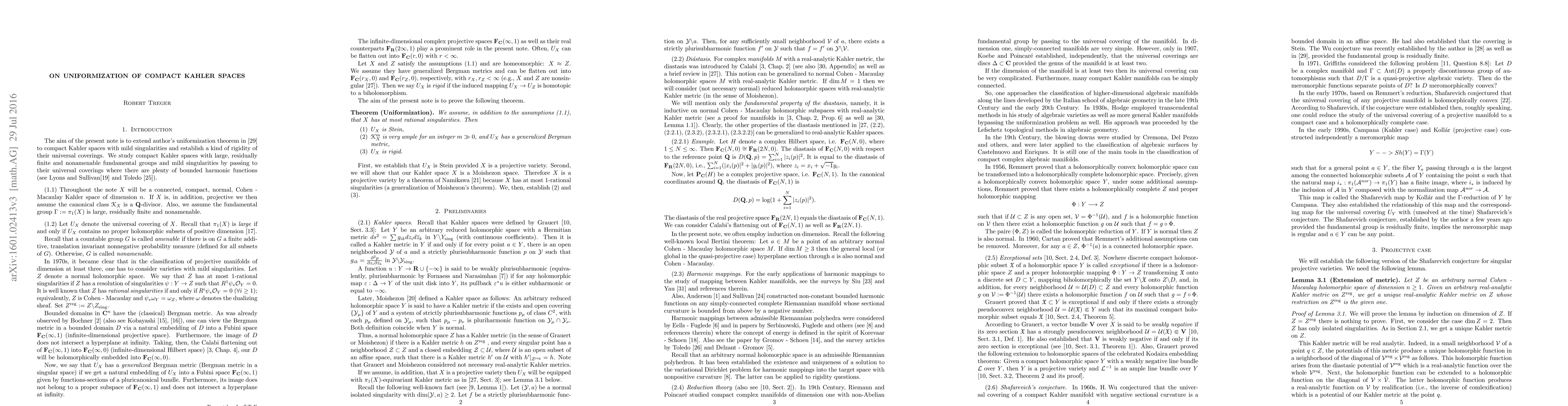 The aim of the note is to extend the uniformization theorem to compact Kahler spaces X with mild singularities and establish a kind of rigidity of their universal coverings. We assume the fundamental group of X is large, residually finite and nonamenable.
