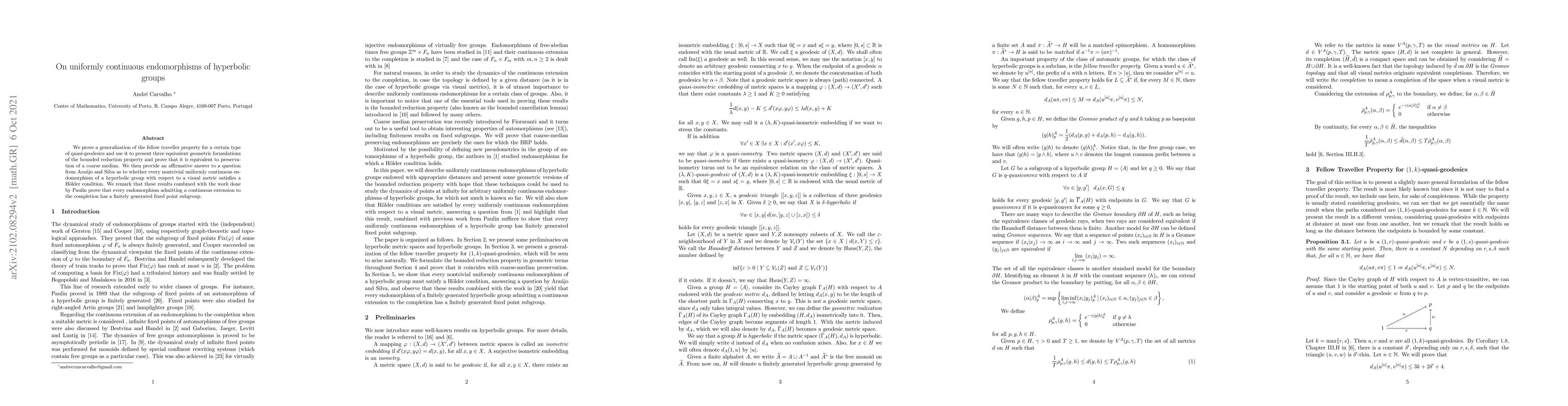 We prove a generalization of the fellow traveller property for a certain type of quasi-geodesics and use it to present three equivalent geometric formulations of the bounded reduction property and prove that it is equivalent to preservation of a coarse median. We then provide an affirmative answer to a question from Ara\'ujo and Silva as to whether every nontrivial uniformly continuous endomorphism of a hyperbolic group with respect to a visual metric satisfies a H\"older condition. We remark that these results combined with the work done by Paulin prove that every endomorphism admitting a continuous extension to the completion has a finitely generated fixed point subgroup.