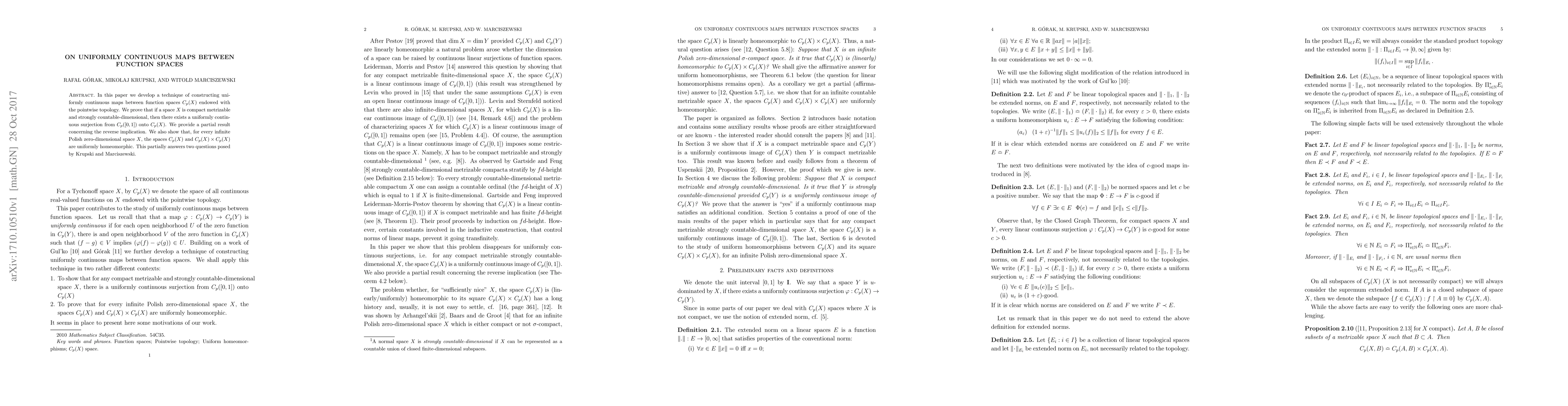This paper constructs uniformly continuous maps between function spaces Cp(X) with pointwise topology, proving the existence of a uniformly continuous surjection from Cp([0,1]) onto Cp(X) for compact metrizable, strongly countable-dimensional spaces X. It also demonstrates the uniform homeomorphism between Cp(X) and Cp(X) x Cp(X) for infinite Polish zero-dimensional spaces X.