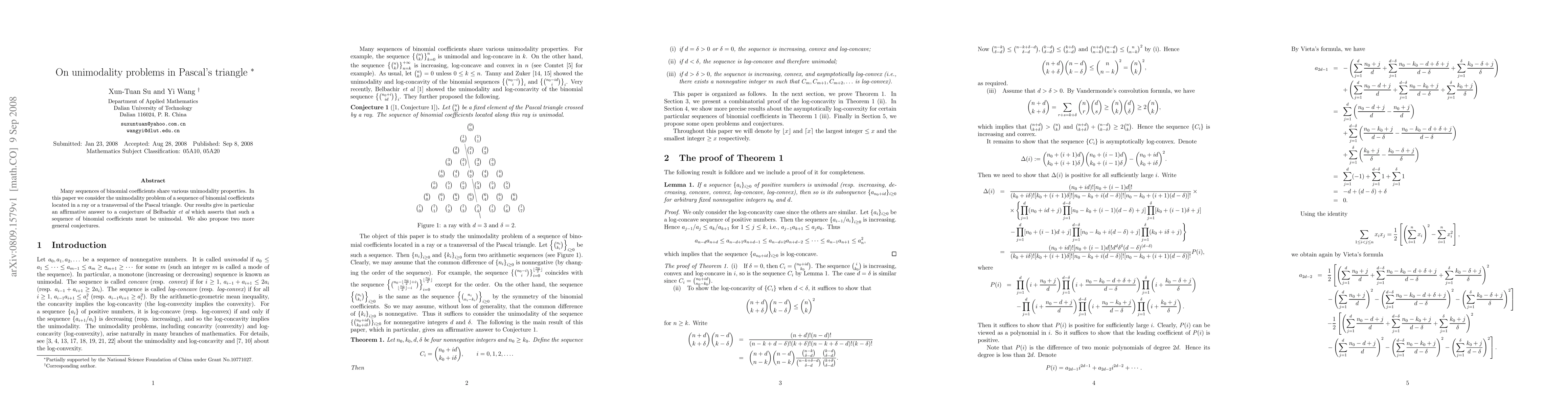 This paper investigates unimodality properties of binomial coefficients in Pascal's triangle, confirming a conjecture by Belbachir et al. that sequences in rays or transversals are unimodal, and proposes two broader conjectures.