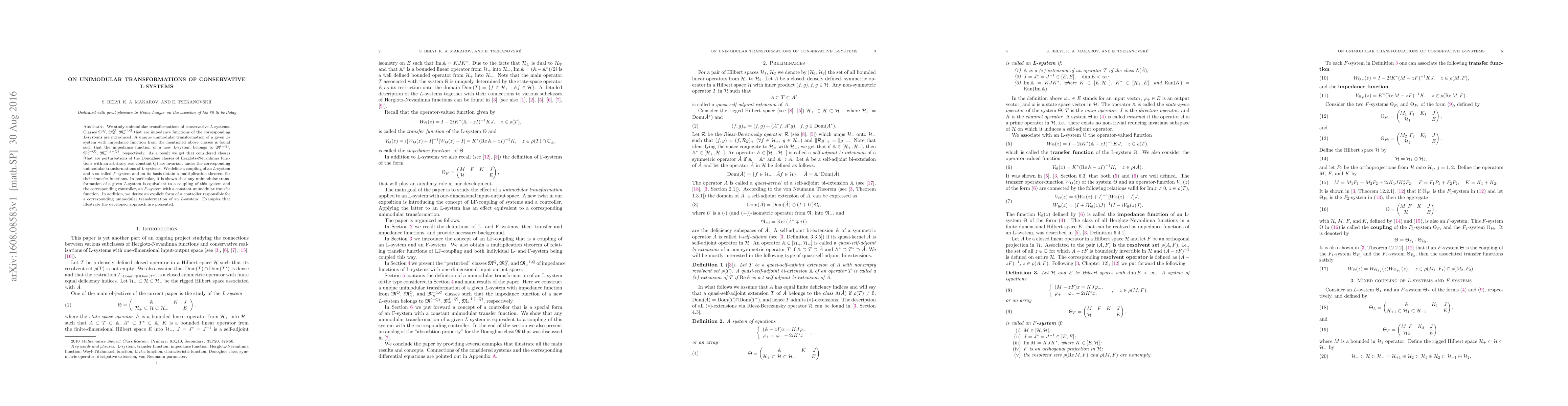 We study unimodular transformations of conservative $L$-systems. Classes $\sM^Q$, $\sM^Q_\kappa$, $\sM^{-1,Q}_\kappa$ that are impedance functions of the corresponding $L$-systems are introduced. A unique unimodular transformation of a given $L$-system with impedance function from the mentioned above classes is found such that the impedance function of a new $L$-system belongs to $\sM^{(-Q)}$, $\sM^{(-Q)}_\kappa$, $\sM^{-1,(-Q)}_\kappa$, respectively. As a result we get that considered classes (that are perturbations of the Donoghue classes of Herglotz-Nevanlinna functions with an arbitrary real constant $Q$) are invariant under the corresponding unimodular transformations of $L$-systems. We define a coupling of an $L$-system and a so called $F$-system and on its basis obtain a multiplication theorem for their transfer functions. In particular, it is shown that any unimodular transformation of a given $L$-system is equivalent to a coupling of this system and the corresponding controller, an $F$-system with a constant unimodular transfer function. In addition, we derive an explicit form of a controller responsible for a corresponding unimodular transformation of an $L$-system. Examples that illustrate the developed approach are presented.