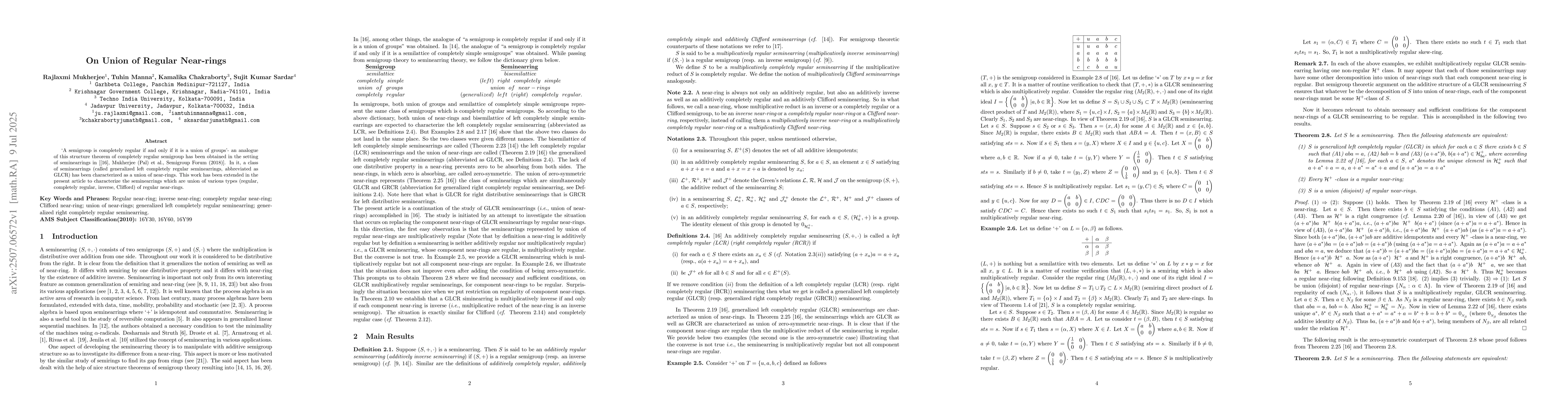 'A semigroup is completely regular if and only if it is a union of groups'- an analogue of this structure theorem of completely regular semigroup has been obtained in the setting of seminearrings in [[16], Mukherjee (Pal) et al., Semigroup Forum (2018)]. In it, a class of seminearrings (called generalized left completely regular seminearrings, abbreviated as GLCR) has been characterized as a union of near-rings. This work has been extended in the present article to characterize the seminearrings which are union of various types (regular, completely regular, inverse, Clifford) of regular near-rings.