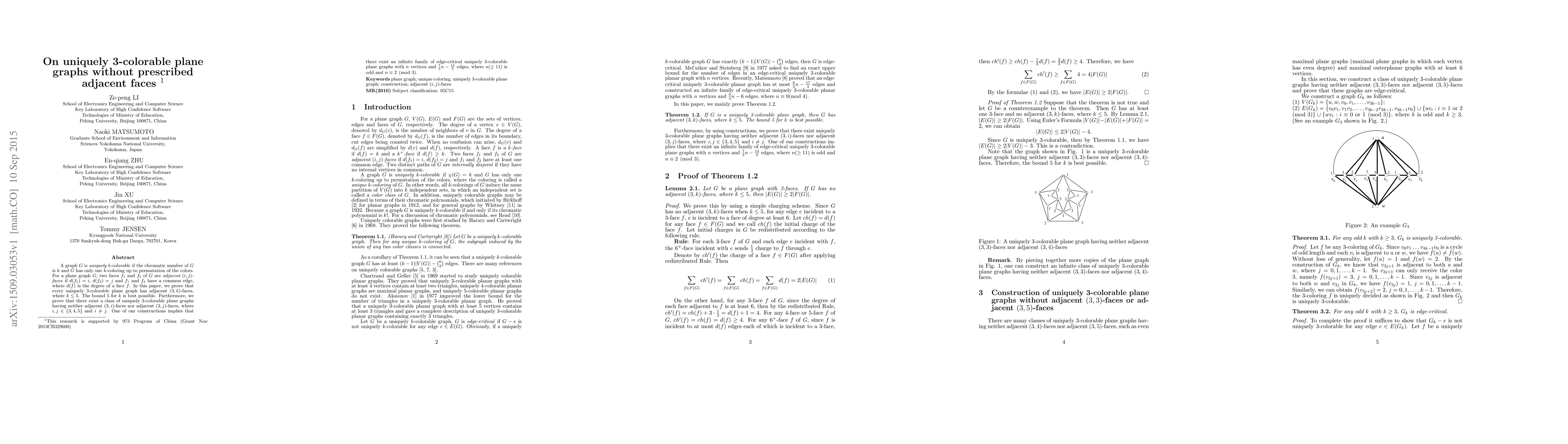 This paper proves that every uniquely 3-colorable plane graph must have adjacent $(3,k)$-faces with $k\leq 5$. It also constructs an infinite family of such graphs lacking adjacent $(3,i)$-faces for $i\in \{3,4,5\}$, and demonstrates a specific edge-critical structure.