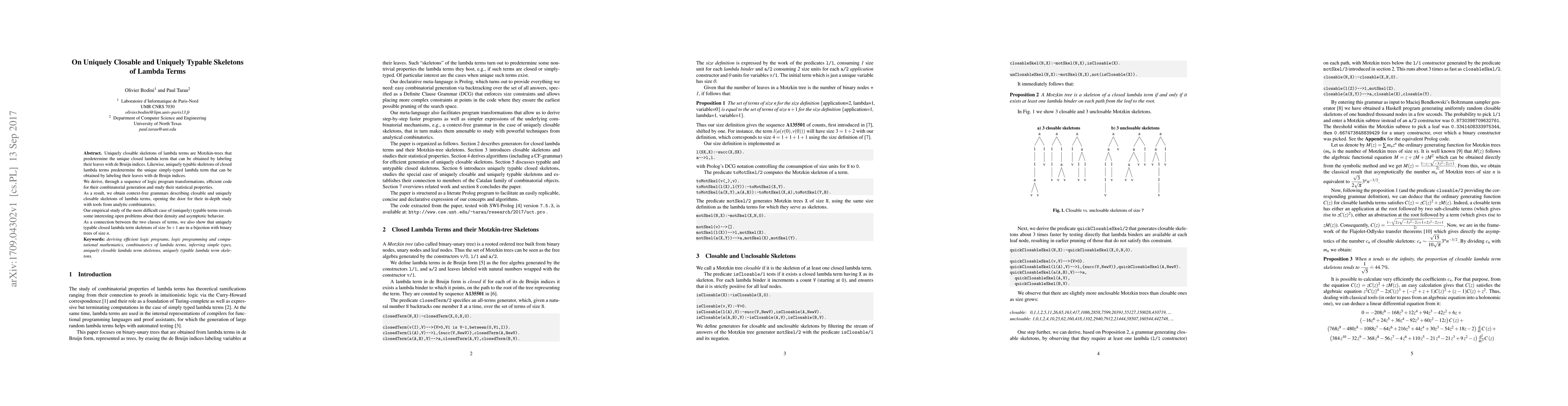 Uniquely closable skeletons of lambda terms are Motzkin-trees that predetermine the unique closed lambda term that can be obtained by labeling their leaves with de Bruijn indices. Likewise, uniquely typable skeletons of closed lambda terms predetermine the unique simply-typed lambda term that can be obtained by labeling their leaves with de Bruijn indices. We derive, through a sequence of logic program transformations, efficient code for their combinatorial generation and study their statistical properties. As a result, we obtain context-free grammars describing closable and uniquely closable skeletons of lambda terms, opening the door for their in-depth study with tools from analytic combinatorics. Our empirical study of the more difficult case of (uniquely) typable terms reveals some interesting open problems about their density and asymptotic behavior. As a connection between the two classes of terms, we also show that uniquely typable closed lambda term skeletons of size $3n+1$ are in a bijection with binary trees of size $n$.