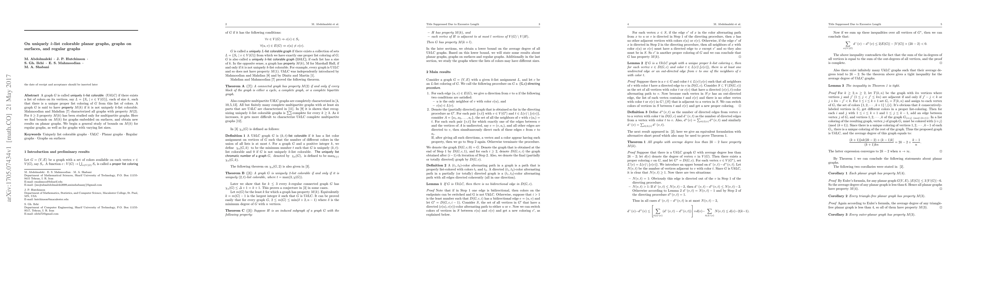 A graph $G$ is called uniquely k-list colorable (U$k$LC) if there exists a list of colors on its vertices, say $L=\lbrace S_v \mid v \in V(G) \rbrace $, each of size $k$, such that there is a unique proper list coloring of $G$ from this list of colors. A graph $G$ is said to have property $M(k)$ if it is not uniquely $k$-list colorable. Mahmoodian and Mahdian characterized all graphs with property $M(2)$. For $k\geq 3$ property $M(k)$ has been studied only for multipartite graphs. Here we find bounds on $M(k)$ for graphs embedded on surfaces, and obtain new results on planar graphs. We begin a general study of bounds on $M(k)$ for regular graphs, as well as for graphs with varying list sizes.