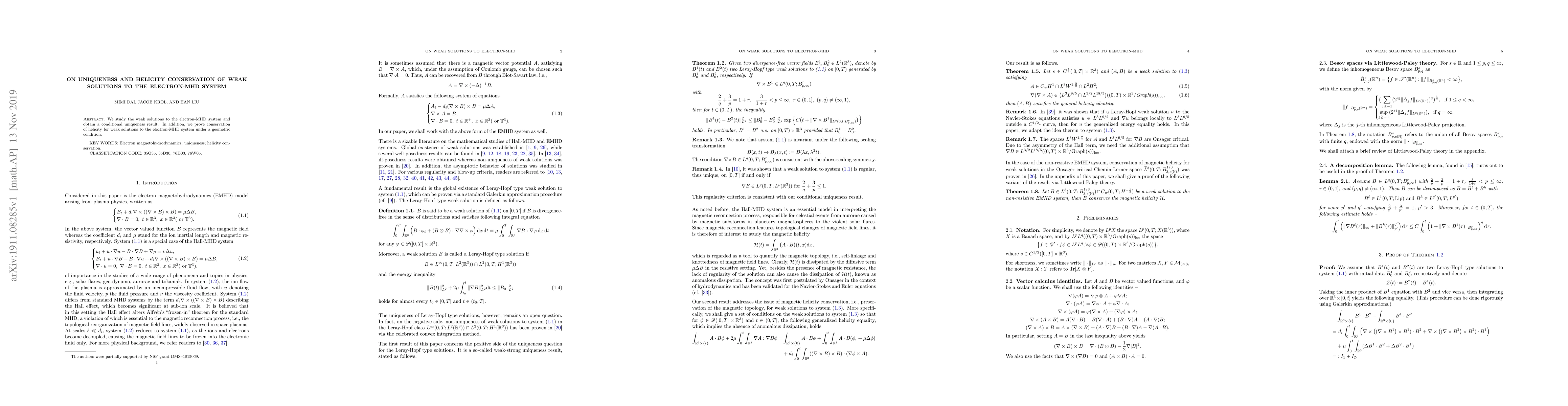 This paper investigates weak solutions to the electron-MHD system, establishing conditional uniqueness and proving helicity conservation under a specified geometric condition.