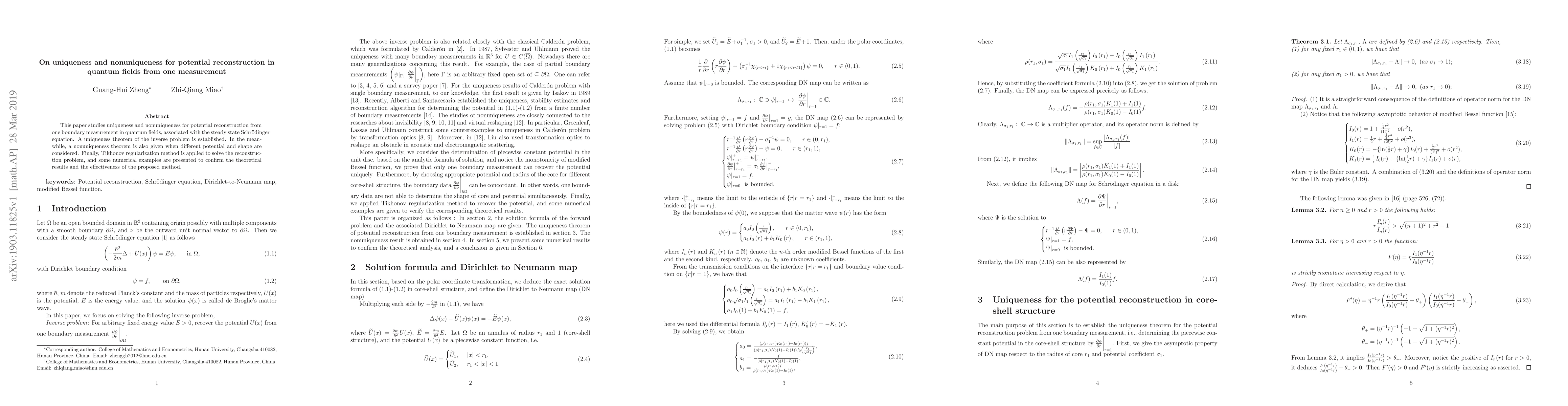 This paper studies uniqueness and nonuniqueness for potential reconstruction from one boundary measurement in quantum fields, associated with the steady state Schr\"{o}dinger equation. A uniqueness theorem of the inverse problem is established. In the meanwhile, a nonuniqueness theorem is also given when different potential and shape are considered. Finally, Tikhonov regularization method is applied to solve the reconstruction problem, and some numerical examples are presented to confirm the theoretical results and the effectiveness of the proposed method.