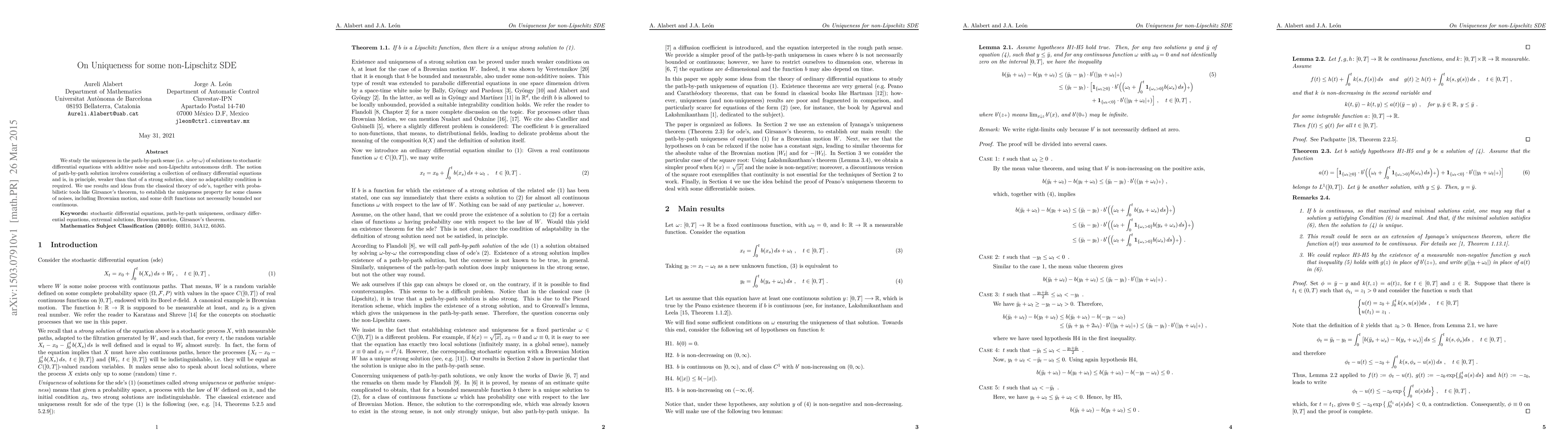 We study the uniqueness in the path-by-path sense (i.e. $\omega$-by-$\omega$) of solutions to stochastic differential equations with additive noise and non-Lipschitz autonomous drift. The notion of path-by-path solution involves considering a collection of ordinary differential equations and is, in principle, weaker than that of a strong solution, since no adaptability condition is required. We use results and ideas from the classical theory of ode's, together with probabilistic tools like Girsanov's theorem, to establish the uniqueness property for some classes of noises, including Brownian motion, and some drift functions not necessarily bounded nor continuous.