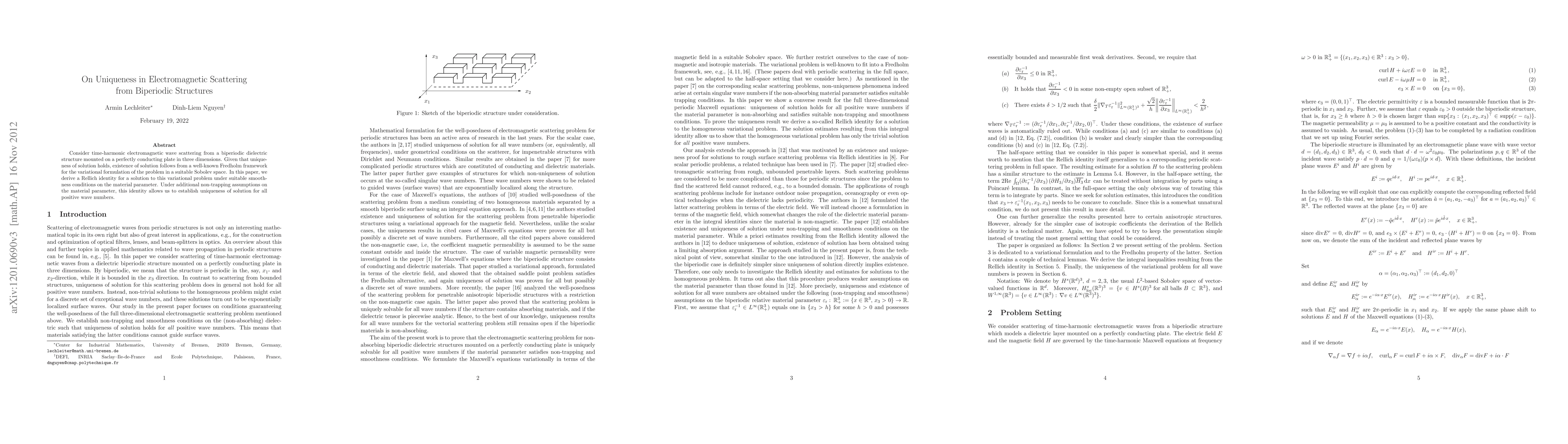 Consider time-harmonic electromagnetic wave scattering from a biperiodic dielectric structure mounted on a perfectly conducting plate in three dimensions. Given that uniqueness of solution holds, existence of solution follows from a well-known Fredholm framework for the variational formulation of the problem in a suitable Sobolev space. In this paper, we derive a Rellich identity for a solution to this variational problem under suitable smoothness conditions on the material parameter. Under additional non-trapping assumptions on the material parameter, this identity allows us to establish uniqueness of solution for all wave numbers.