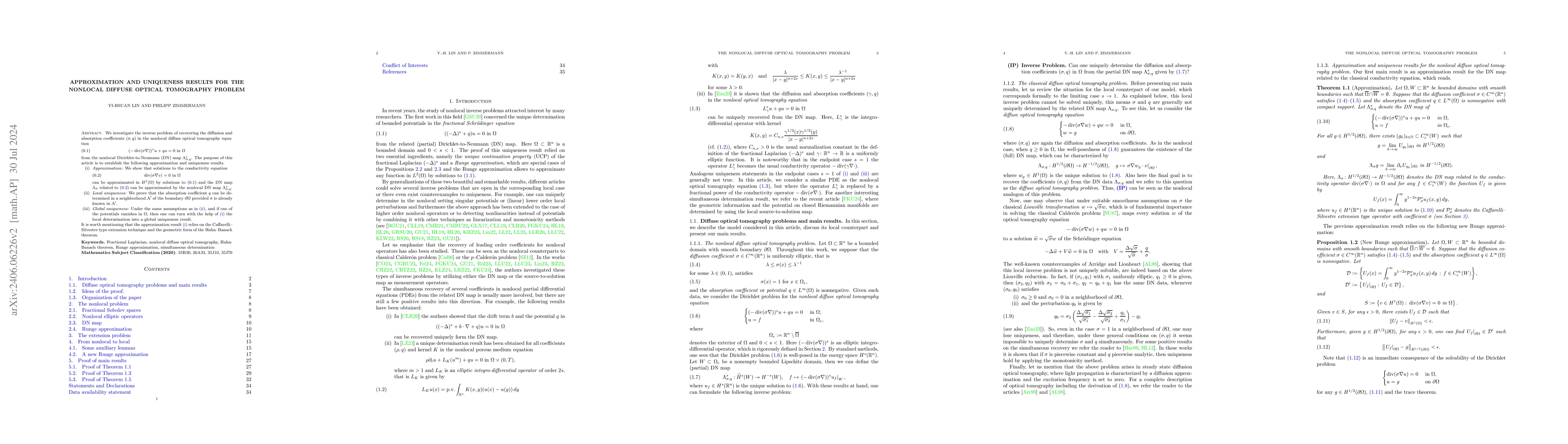 We investigate the inverse problem of recovering the diffusion and absorption coefficients $(\sigma,q)$ in the nonlocal diffuse optical tomography equation $(-\text{div}( \sigma \nabla))^s u+q u =0$ from the (partial) Dirichlet-to-Neumann map. The purpose of this article is twofold: (i) Firstly, we show that the diffusion coefficient $\sigma$ and absorption coefficient $q$ can be recovered simultaneously. (ii) Secondly, we prove that the absorption coefficient $q$ can be determined provided $\sigma$ is known in a neighborhood of the boundary $\partial\Omega$. The key ingredients to prove these uniqueness results are the Caffarelli--Silvestre type extension technique and a novel Runge approximation related to solution spaces of two different partial differential equations, which is based on the geometric form of the Hahn--Banach theorem. The results in this work hold for any dimension $n\geq 3$.