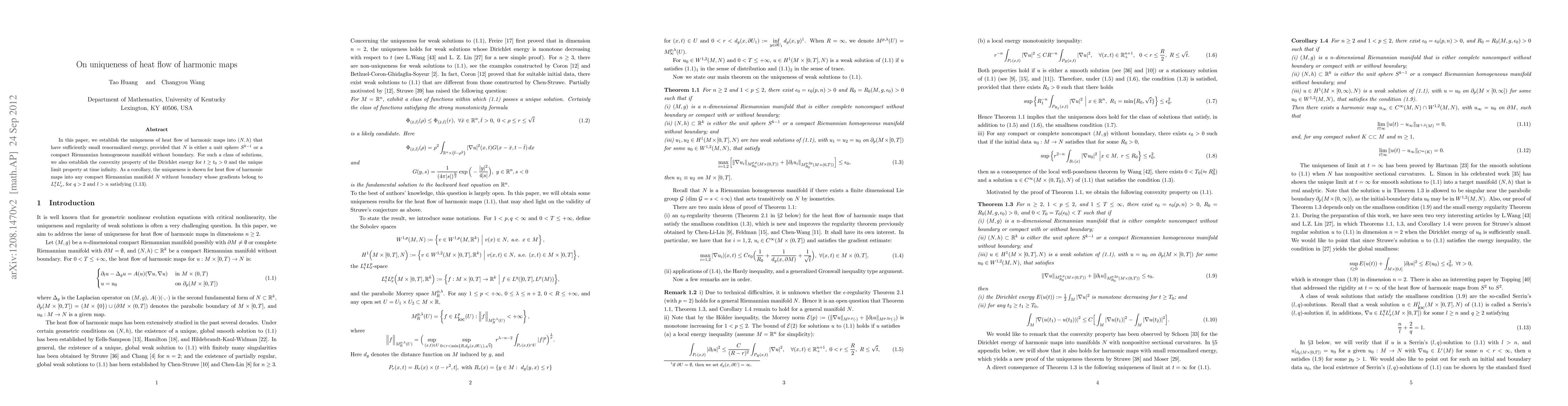 This paper proves the uniqueness of heat flow for harmonic maps into specific compact Riemannian manifolds, showing convexity and limit properties for solutions with small renormalized energies. The uniqueness extends to maps into any compact manifold meeting certain gradient conditions.