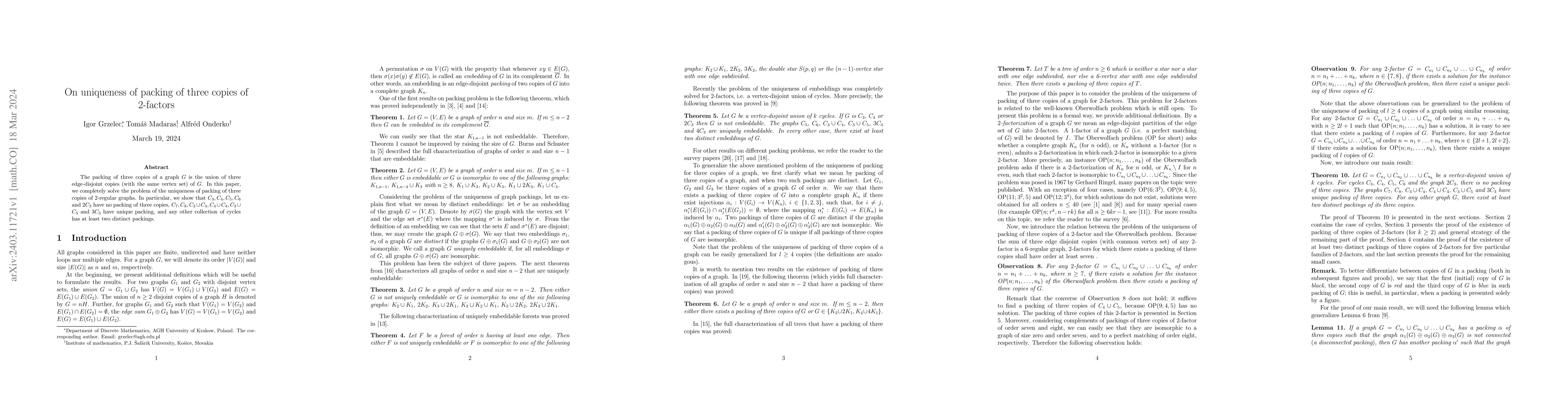 This paper addresses the uniqueness of packing three copies of 2-regular graphs, finding that only $C_7,C_8,C_3 \cup C_4, C_4 \cup C_4, C_3 \cup C_5$, and $3C_3$ have unique packings, while others, including $C_3,C_4,C_5,C_6$ and $2C_3$, have no or at least two distinct packings.