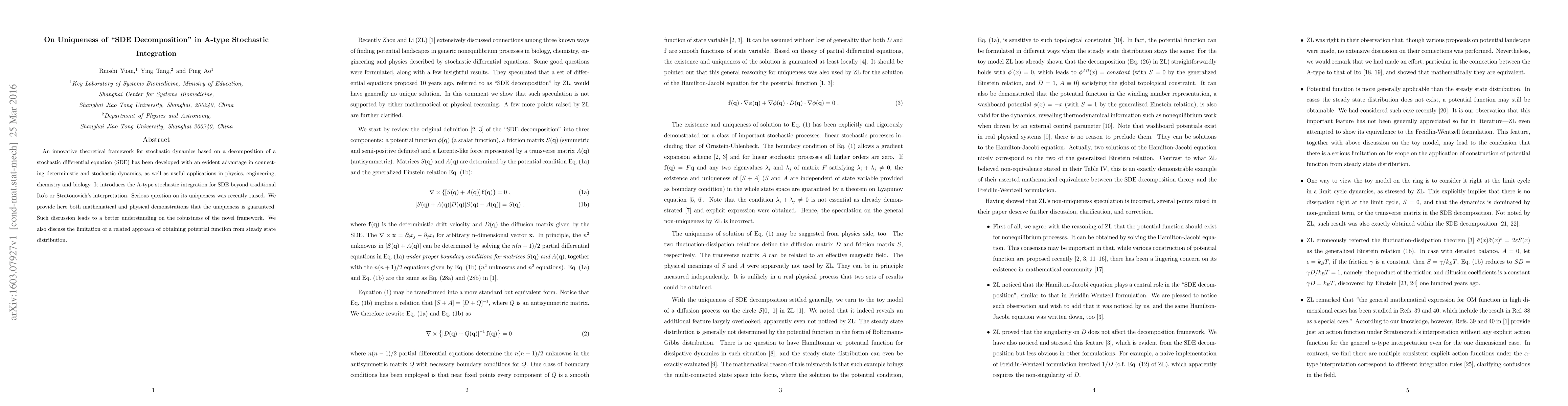 An innovative theoretical framework for stochastic dynamics based on a decomposition of a stochastic differential equation (SDE) has been developed with an evident advantage in connecting deterministic and stochastic dynamics, as well as useful applications in physics, engineering, chemistry and biology. It introduces the A-type stochastic integration for SDE beyond traditional Ito's or Stratonovich's interpretation. Serious question on its uniqueness was recently raised. We provide here both mathematical and physical demonstrations that the uniqueness is guaranteed. Such discussion leads to a better understanding on the robustness of the novel framework. We also discuss the limitation of a related approach of obtaining potential function from steady state distribution.