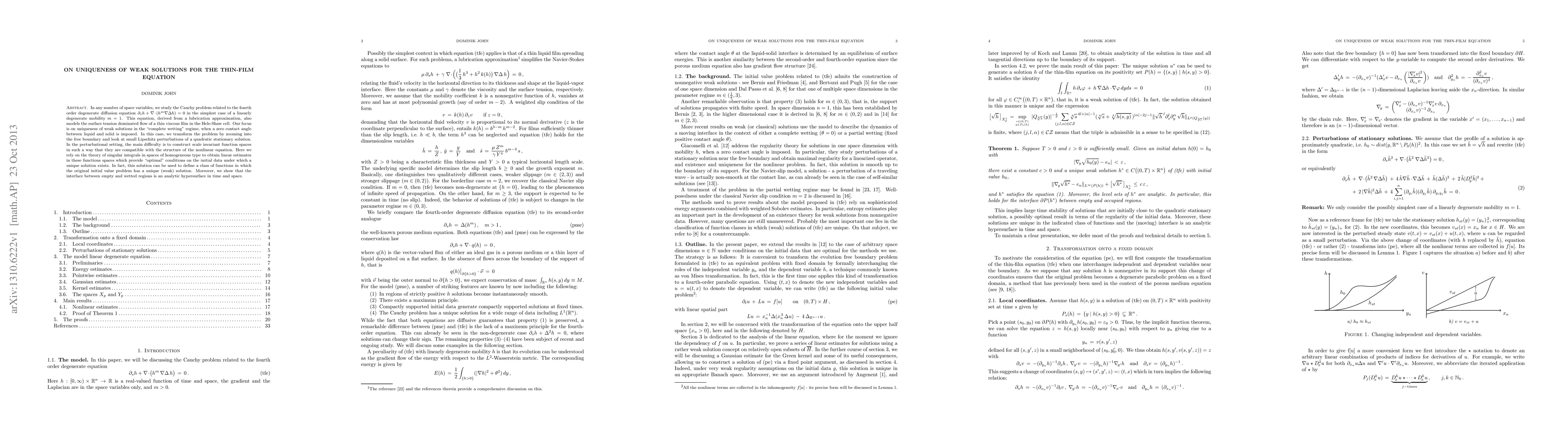 In any number of space variables, we study the Cauchy problem related to the thin-film equation in the simplest case of a linearly degenerate mobility. This equation, derived from a lubrication approximation, also models the surface tension dominated flow of a thin viscous film in the Hele-Shaw cell. Our focus is on uniqueness of weak solutions in the "complete wetting" regime, when a zero contact angle between liquid and solid is imposed. In this case, we transform the problem by zooming into the free boundary and look at small Lipschitz perturbations of a quadratic stationary solution. In the perturbational setting, the main difficulty is to construct scale invariant function spaces in such a way that they are compatible with the structure of the nonlinear equation. Here we rely on the theory of singular integrals in spaces of homogeneous type to obtain linear estimates in these functions spaces which provide "optimal" conditions on the initial data under which a unique solution exists. In fact, this solution can be used to define a class of functions in which the original initial value problem has a unique (weak) solution. Moreover, we show that the interface between empty and wetted regions is an analytic hypersurface in time and space.