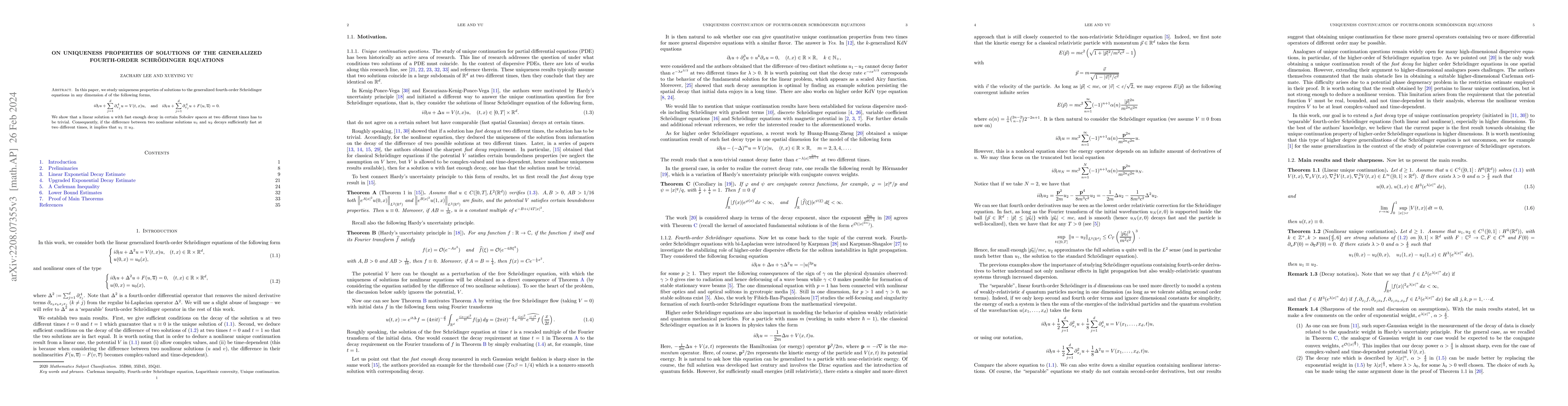 This paper investigates the uniqueness properties of solutions to generalized fourth-order Schrödinger equations, proving that linear solutions with sufficient decay in Sobolev spaces at two different times must be trivial, and that sufficiently fast decay of the difference between two nonlinear solutions at two times implies they are identical.