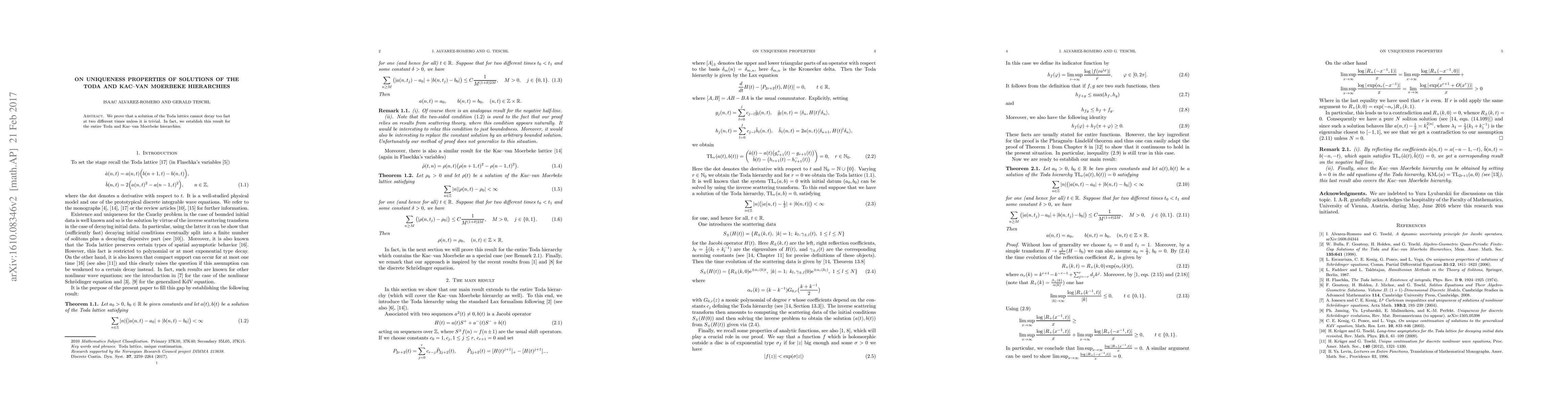 Summary: The paper proves that solutions of the Toda lattice and Kac-van Moerbeke hierarchies cannot decay rapidly at different times unless they are trivial, establishing this uniqueness property for both hierarchies.