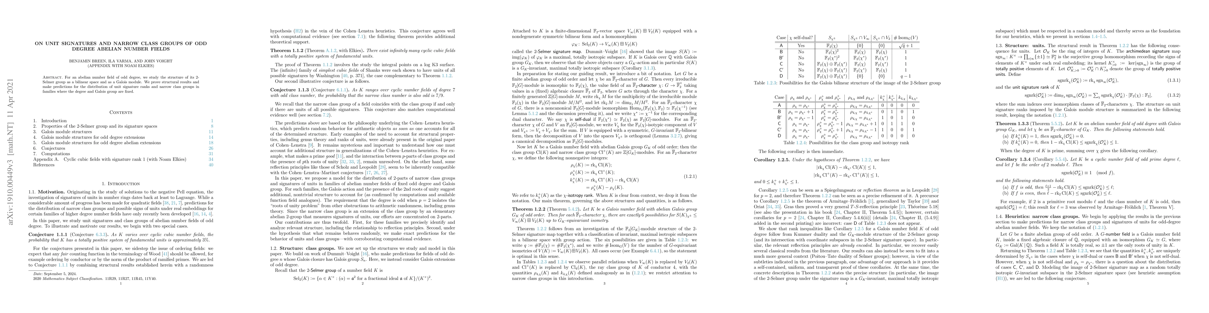 For an abelian number field of odd degree, we study the structure of its 2-Selmer group as a bilinear space and as a Galois module. We prove structural results and make predictions for the distribution of unit signature ranks and narrow class groups in families where the degree and Galois group are fixed.