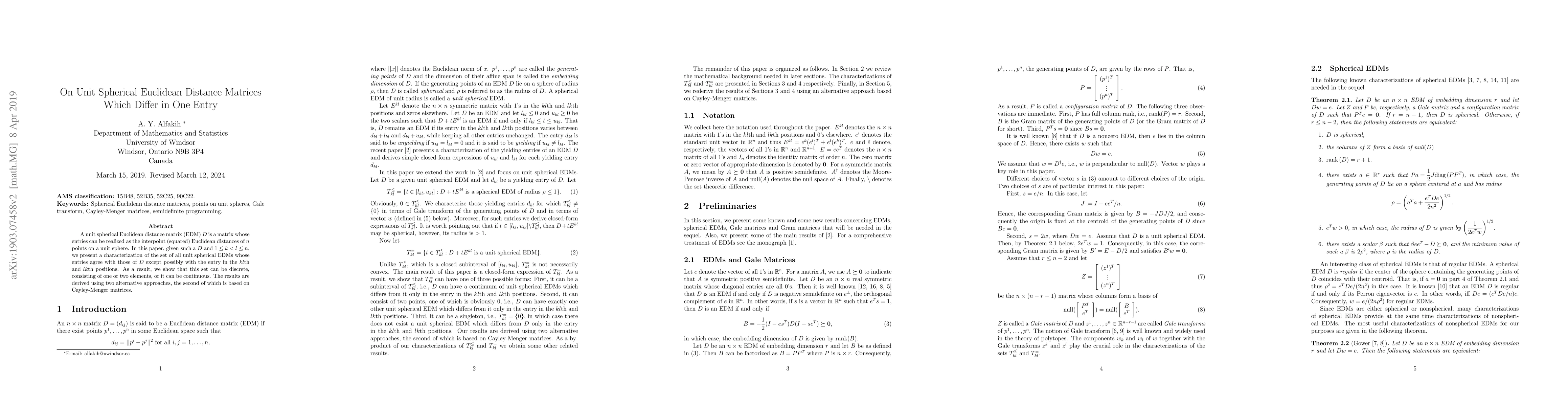 Researchers characterized the set of unit spherical Euclidean distance matrices that differ from a given matrix in only two entries, showing they can be discrete or continuous.