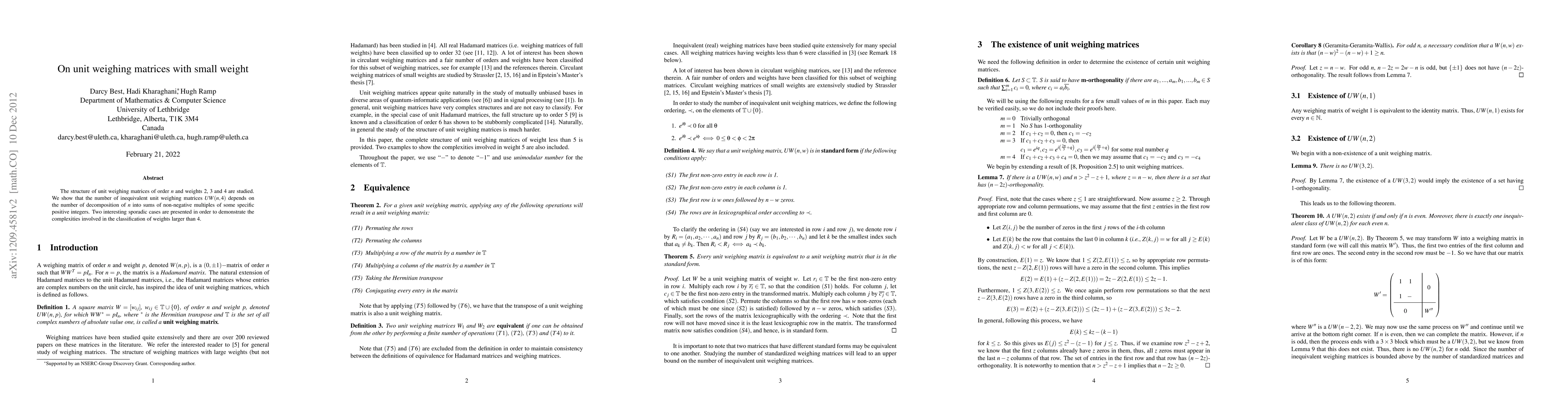 The research introduces new insights into the structure of unit weighing matrices, particularly for weight 3 and 4, and identifies a unique UWM(5,4) up to equivalence, which was previously not well-documented.