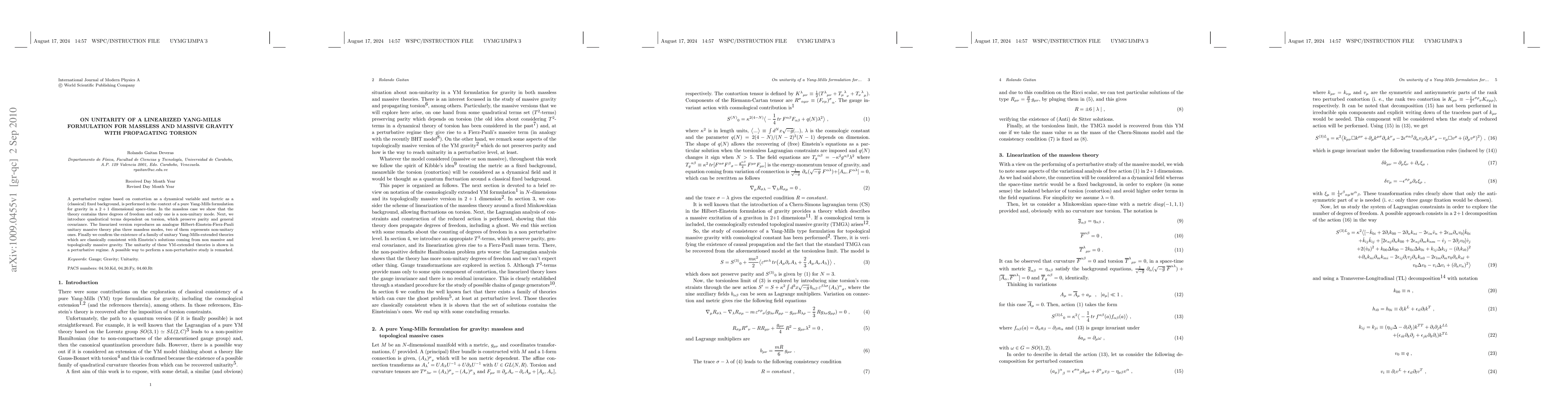 A perturbative regime based on contortion as a dynamical variable and metric as a (classical) fixed background, is performed in the context of a pure Yang-Mills formulation for gravity in a $2+1$ dimensional space-time. In the massless case we show that the theory contains three degrees of freedom and only one is a non-unitary mode. Next, we introduce quadratical terms dependent on torsion, which preserve parity and general covariance. The linearized version reproduces an analogue Hilbert-Einstein-Fierz-Pauli unitary massive theory plus three massless modes, two of them represents non-unitary ones. Finally we confirm the existence of a family of unitary Yang-Mills-extended theories which are classically consistent with Einstein's solutions coming from non massive and topologically massive gravity. The unitarity of these YM-extended theories is shown in a perturbative regime. A possible way to perform a non-perturbative study is remarked.