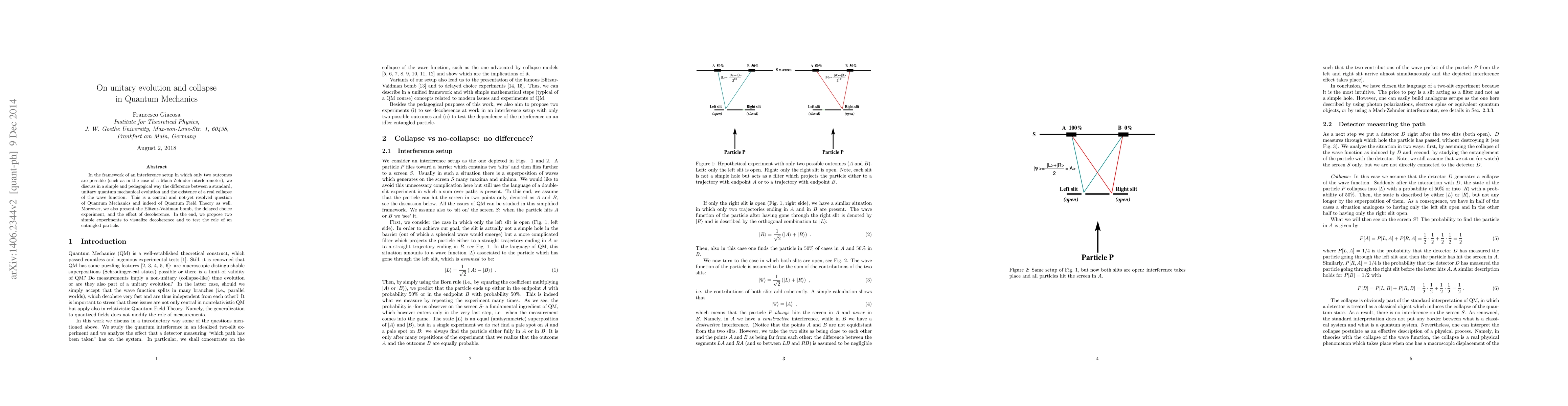 In the framework of an interference setup in which only two outcomes are possible (such as in the case of a Mach-Zehnder interferometer), we discuss in a simple and pedagogical way the difference between a standard, unitary quantum mechanical evolution and the existence of a real collapse of the wave function. Moreover, we also present the Elitzur-Vaidman bomb, the delayed choice experiment, and the effect of decoherence. In the end, we propose two simple experiments to visualize decoherence and to test the role of an entagled particle.